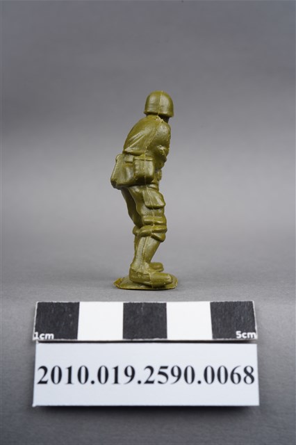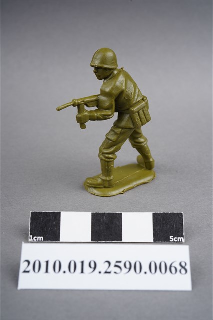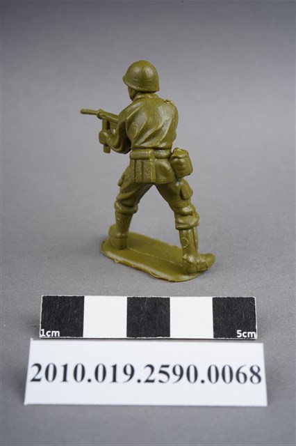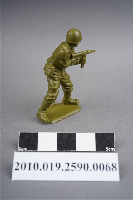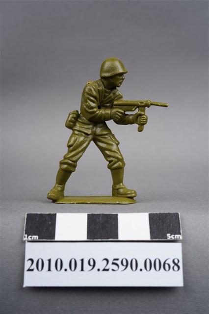 1.本物件為綠色步兵造型玩具士兵,高約5公分,寬約為3公分,為塑膠材質。外型為步兵,士兵頭戴鋼盔,身著軍服,腰帶上有彈匣及水壺,雙手持衝鋒槍。左背及兩小腿後方各有一圓形痕,右肩有殘膠。物件整體底部連接著稱為「pod feet」的底板,底板底部平整,邊緣有些微磨損。物件兩側可見射出接縫線,有多處磨損痕跡。本系列玩具士兵多為相同塑膠模版,僅有顏色不同,或是同色同塑膠模版等形式。2.1938年美國玩具公司Bergen Toy and Novelty Co.開始銷售廉價的塑膠微型單色士兵系列,高約2英寸,各有不同的作戰姿勢及工具武器,美軍部分參照美軍部隊使用了軍綠色,之後推出灰色的德軍部隊及黃色的日軍部隊。1950年代因塑膠製造業的蓬勃發展,以及鉛中毒的恐慌,使得塑膠製且價格低廉的玩具士兵取代昂貴的彩繪金屬士兵,並定型為目前廣為人知的二戰系列。除了士兵系列外,市面上亦能見到牛仔與印地安人、太空人、騎士、恐龍、消防員、警察等各種角色。