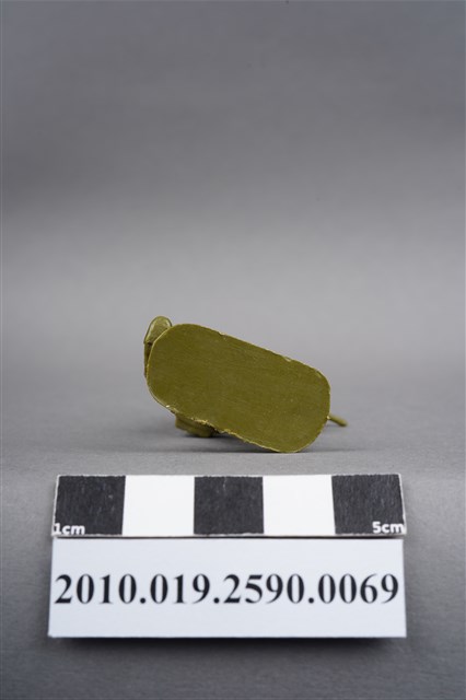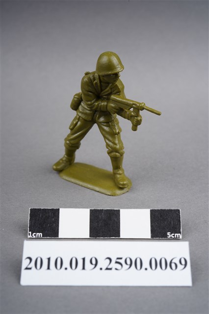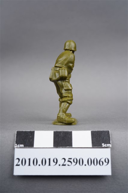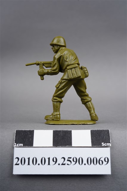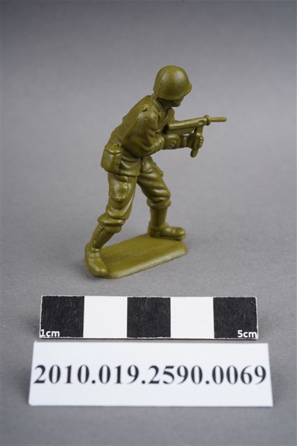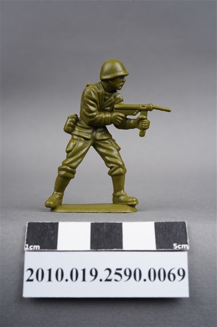 1.本物件為綠色步兵造型玩具士兵,高約5公分,寬約為3公分,為塑膠材質。外型為步兵,士兵頭戴鋼盔,身著軍服,腰帶上有彈匣及水壺,雙手持衝鋒槍。左背及兩小腿後方各有一圓形痕,右肩有殘膠。物件整體底部連接著稱為「pod feet」的底板,底板底部平整,邊緣有些微磨損及殘膠。物件兩側可見射出接縫線,有多處磨損痕跡。本系列玩具士兵多為相同塑膠模版,僅有顏色不同,或是同色同塑膠模版等形式。2.1938年美國玩具公司Bergen Toy and Novelty Co.開始銷售廉價的塑膠微型單色士兵系列,高約2英寸,各有不同的作戰姿勢及工具武器,美軍部分參照美軍部隊使用了軍綠色,之後推出灰色的德軍部隊及黃色的日軍部隊。1950年代因塑膠製造業的蓬勃發展,以及鉛中毒的恐慌,使得塑膠製且價格低廉的玩具士兵取代昂貴的彩繪金屬士兵,並定型為目前廣為人知的二戰系列。除了士兵系列外,市面上亦能見到牛仔與印地安人、太空人、騎士、恐龍、消防員、警察等各種角色。