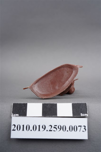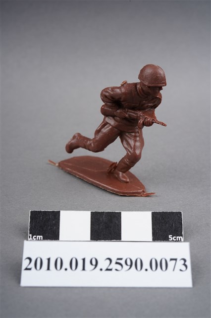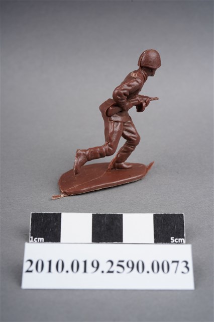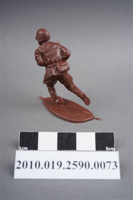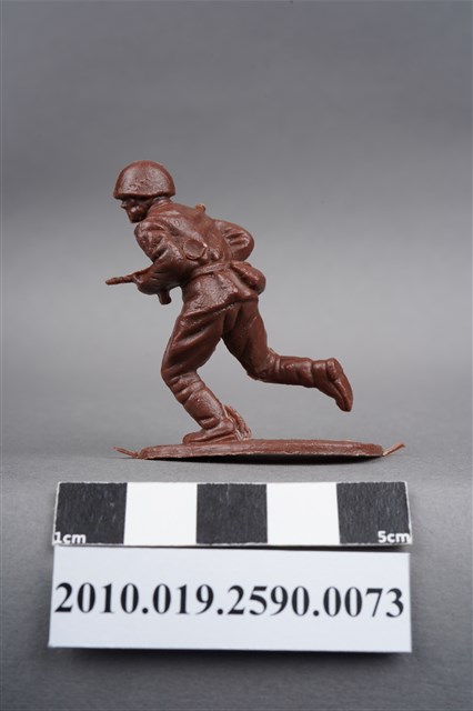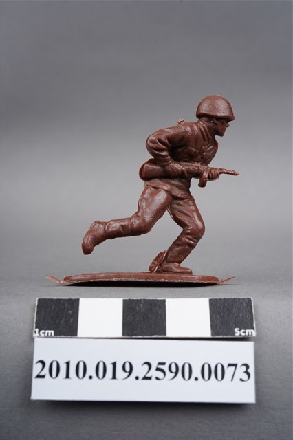 1.本物件為紅色步兵造型玩具士兵,高約4公分,寬約為3公分,為塑膠材質。外型為步兵,士兵頭戴鋼盔,身著軍服,腰帶上有腰袋,腳著軍靴。雙手持衝鋒槍於胸前,為奔跑姿。右肩有射出痕,左背有一圓形痕,左腳鞋跟有大片殘膠。物件整體底部連接著稱為「pod feet」的底板,底板底部為下凹式構造,邊緣及底部有殘膠及磨損情況。物件兩側可見射出接縫線。本系列玩具士兵多為相同塑膠模版,僅有顏色不同,或是同色同塑膠模版等形式。2.1938年美國玩具公司Bergen Toy and Novelty Co.開始銷售廉價的塑膠微型單色士兵系列,高約2英寸,各有不同的作戰姿勢及工具武器,美軍部分參照美軍部隊使用了軍綠色,之後推出灰色的德軍部隊及黃色的日軍部隊。1950年代因塑膠製造業的蓬勃發展,以及鉛中毒的恐慌,使得塑膠製且價格低廉的玩具士兵取代昂貴的彩繪金屬士兵,並定型為目前廣為人知的二戰系列。除了士兵系列外,市面上亦能見到牛仔與印地安人、太空人、騎士、恐龍、消防員、警察等各種角色。