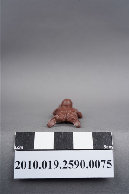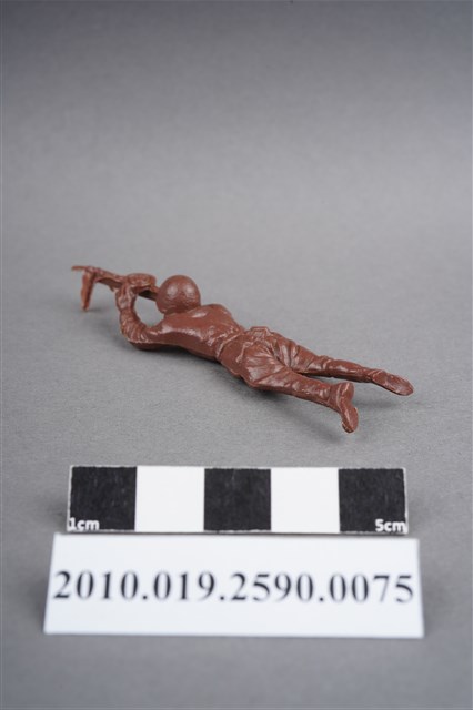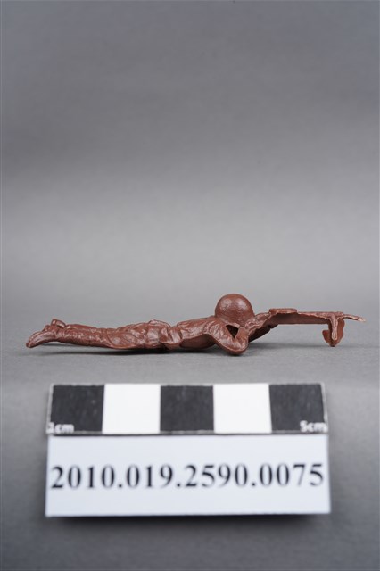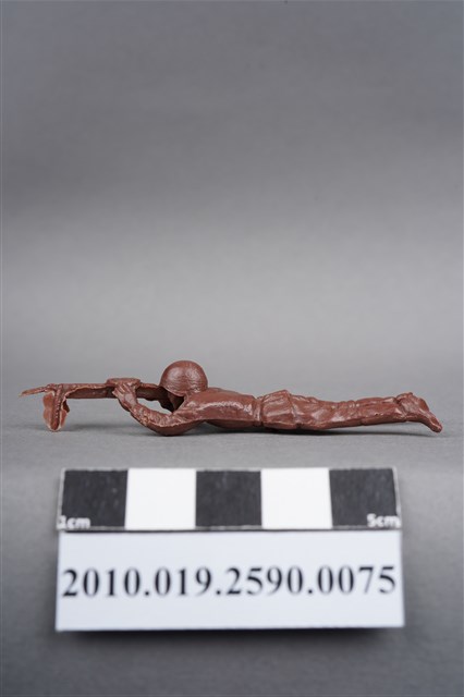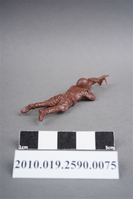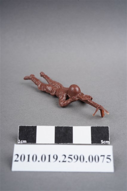 1.本物件為紅色狙擊兵造型玩具士兵,高約1.5公分,長約為6公分,為塑膠材質。外型為狙擊兵,士兵頭戴鋼盔,身著軍服,腰帶上有水壺,腳著軍靴,呈趴卧姿,雙手持握立於雙腳架上的狙擊槍,做瞄準貌。狙擊槍結構簡單,似有缺損,有多處殘膠。下腹部有殘膠。物件兩側可見射出接縫線。本系列玩具士兵多為相同塑膠模版,僅有顏色不同,或是同色同塑膠模版等形式。2.1938年美國玩具公司Bergen Toy and Novelty Co.開始銷售廉價的塑膠微型單色士兵系列,高約2英寸,各有不同的作戰姿勢及工具武器,美軍部分參照美軍部隊使用了軍綠色,之後推出灰色的德軍部隊及黃色的日軍部隊。1950年代因塑膠製造業的蓬勃發展,以及鉛中毒的恐慌,使得塑膠製且價格低廉的玩具士兵取代昂貴的彩繪金屬士兵,並定型為目前廣為人知的二戰系列。除了士兵系列外,市面上亦能見到牛仔與印地安人、太空人、騎士、恐龍、消防員、警察等各種角色。
