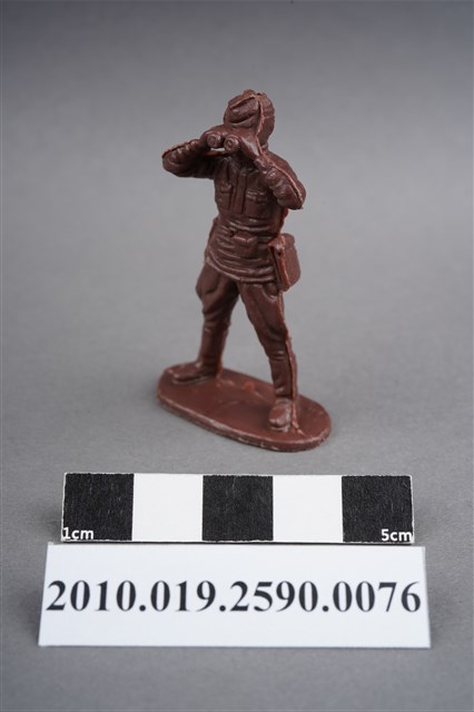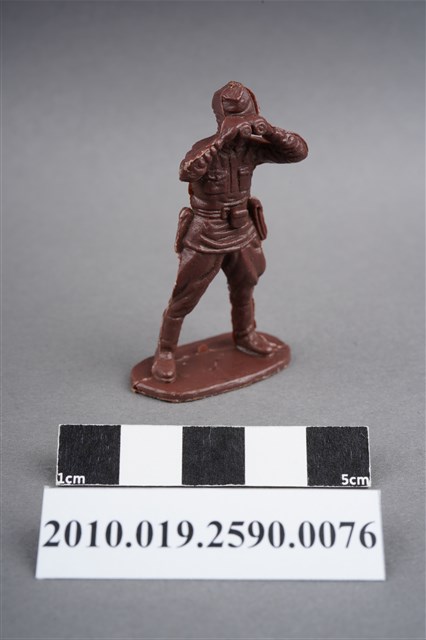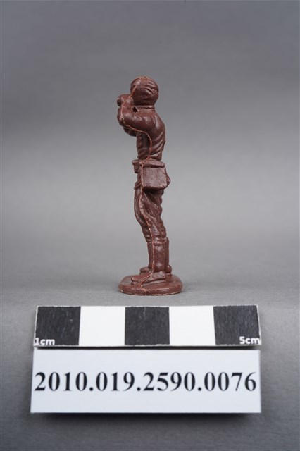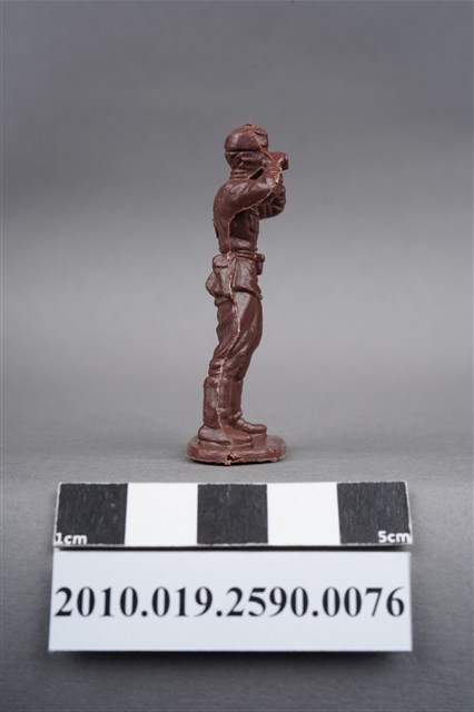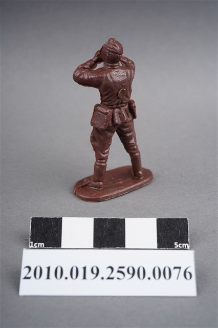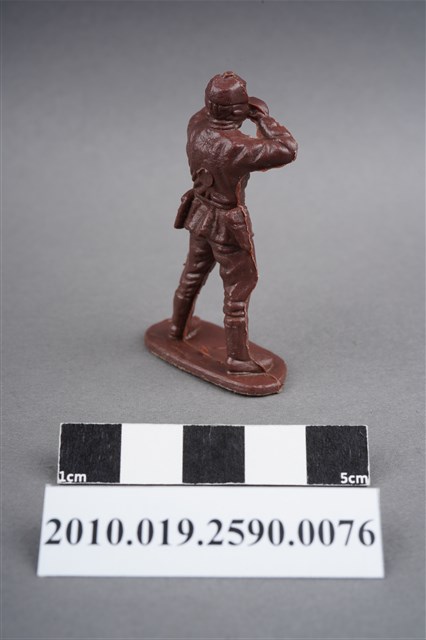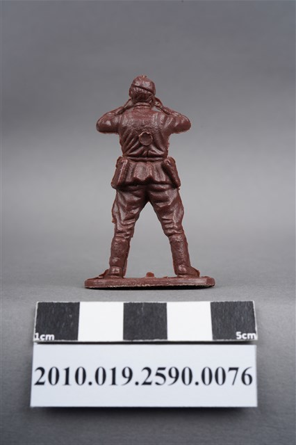 1.本物件為紅色觀測兵造型玩具士兵,高約5公分,寬約為3公分,為塑膠材質。外型為觀測兵,士兵頭戴貝雷帽,帽頂有射出痕。身著軍服,腰帶上有彈袋、槍袋及腰袋,腳著軍靴,雙手持雙筒望遠鏡置於眼前。背部有一圓形痕,物件整體底部連接著稱為「pod feet」的底板,底板底部為下凹式構造,邊緣有磨損情況,內有一突出。物件兩側可見射出接縫線。本系列玩具士兵多為相同塑膠模版,僅有顏色不同,或是同色同塑膠模版等形式。2.1938年美國玩具公司Bergen Toy and Novelty Co.開始銷售廉價的塑膠微型單色士兵系列,高約2英寸,各有不同的作戰姿勢及工具武器,美軍部分參照美軍部隊使用了軍綠色,之後推出灰色的德軍部隊及黃色的日軍部隊。1950年代因塑膠製造業的蓬勃發展,以及鉛中毒的恐慌,使得塑膠製且價格低廉的玩具士兵取代昂貴的彩繪金屬士兵,並定型為目前廣為人知的二戰系列。除了士兵系列外,市面上亦能見到牛仔與印地安人、太空人、騎士、恐龍、消防員、警察等各種角色。