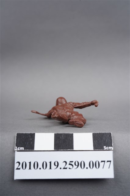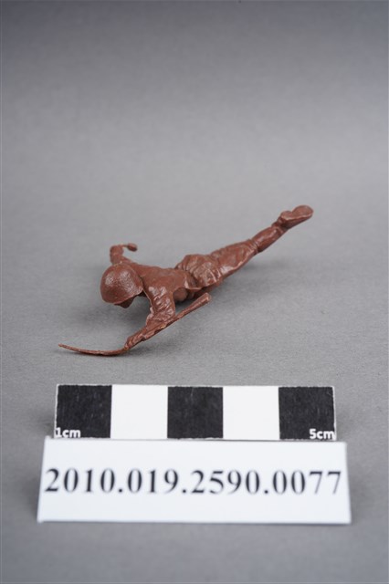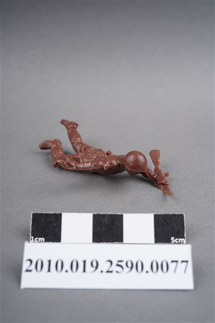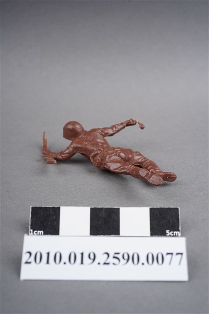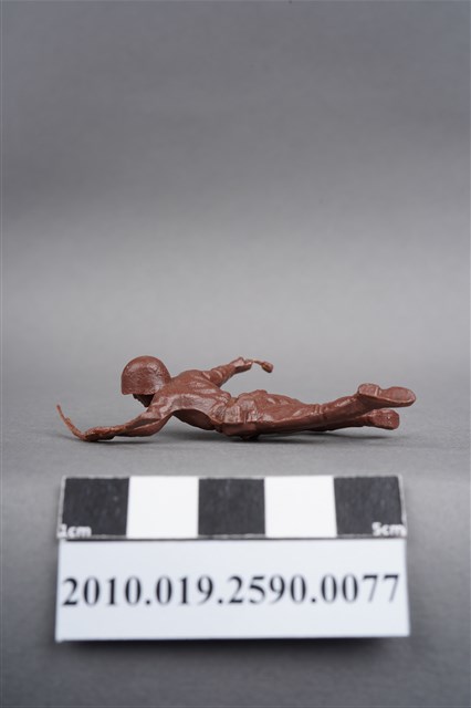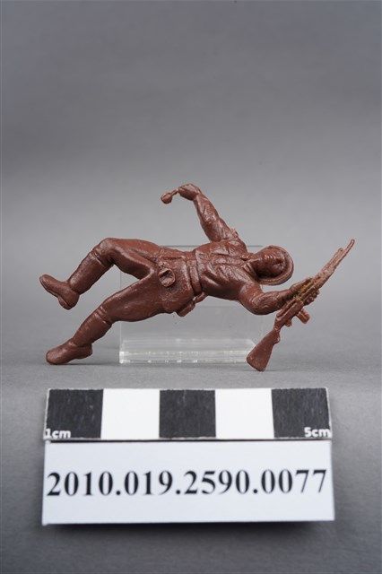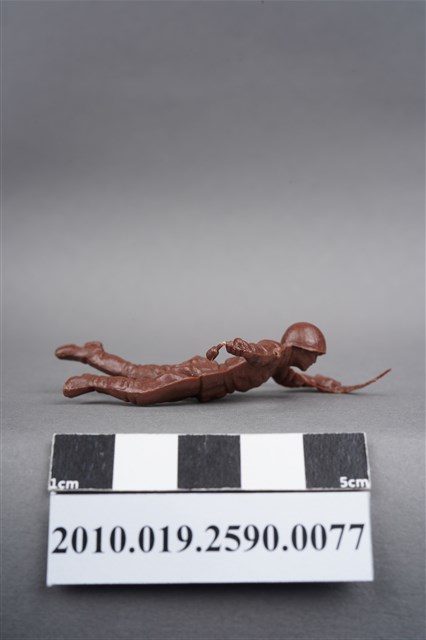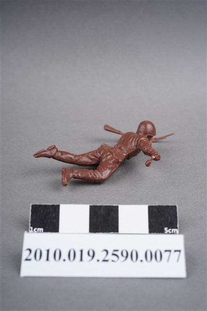 1.本物件為紅色步槍兵造型玩具士兵,寬約3公分,長約為6公分,為塑膠材質。外型為步槍兵,士兵頭戴鋼盔,身著軍服,腰帶上有彈袋,腳著軍靴。士兵為匍匐前進姿,左手持步槍,步槍呈彎曲狀。右手上揚正要拋擲手雷。下腹處有一圓形痕。物件兩側可見射出接縫線,物件整體有多處磨損及污漬毛屑。本系列玩具士兵多為相同塑膠模版,僅有顏色不同,或是同色同塑膠模版等形式。2.1938年美國玩具公司Bergen Toy and Novelty Co.開始銷售廉價的塑膠微型單色士兵系列,高約2英寸,各有不同的作戰姿勢及工具武器,美軍部分參照美軍部隊使用了軍綠色,之後推出灰色的德軍部隊及黃色的日軍部隊。1950年代因塑膠製造業的蓬勃發展,以及鉛中毒的恐慌,使得塑膠製且價格低廉的玩具士兵取代昂貴的彩繪金屬士兵,並定型為目前廣為人知的二戰系列。除了士兵系列外,市面上亦能見到牛仔與印地安人、太空人、騎士、恐龍、消防員、警察等各種角色。