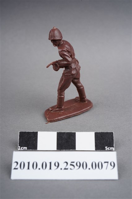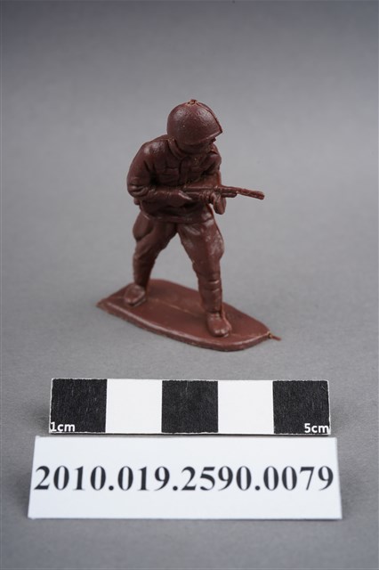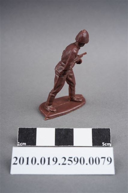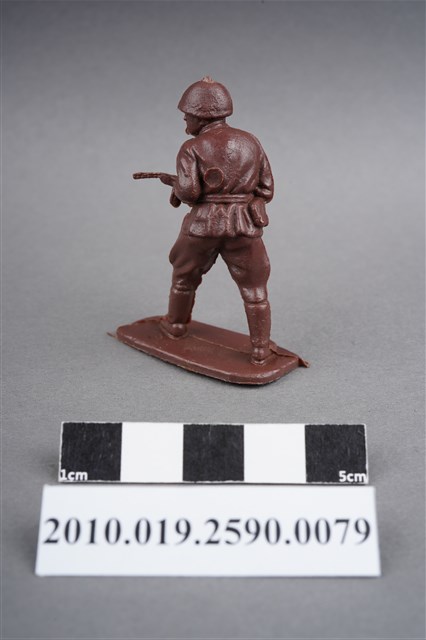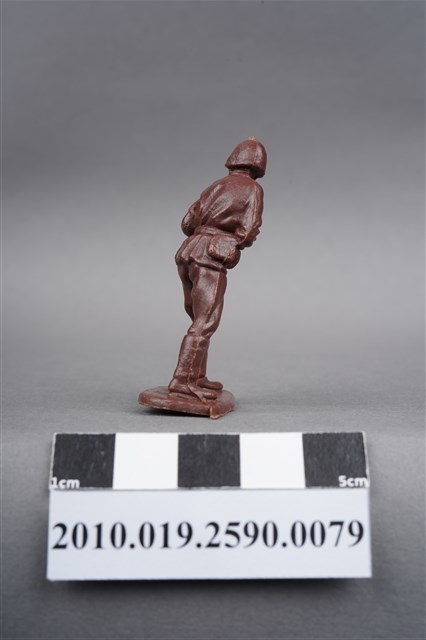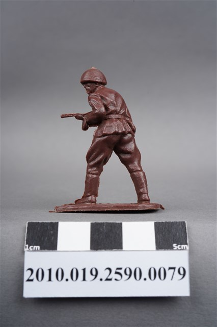 1.本物件為紅色步兵造型玩具士兵,高約5公分,寬約為4公分,為塑膠材質。外型為步兵,士兵頭戴鋼盔,身著軍服,腰帶有一腰袋,腳著軍靴,雙手持配置彈鼓的衝鋒槍,左背部有一圓形痕。物件整體底部連接著稱為「pod feet」的底板,底板底部為下凹式構造,邊緣有磨損及溢膠狀況,內有一突出。物件兩側可見射出接縫線。本系列玩具士兵多為相同塑膠模版,僅有顏色不同,或是同色同塑膠模版等形式。2.1938年美國玩具公司Bergen Toy and Novelty Co.開始銷售廉價的塑膠微型單色士兵系列,高約2英寸,各有不同的作戰姿勢及工具武器,美軍部分參照美軍部隊使用了軍綠色,之後推出灰色的德軍部隊及黃色的日軍部隊。1950年代因塑膠製造業的蓬勃發展,以及鉛中毒的恐慌,使得塑膠製且價格低廉的玩具士兵取代昂貴的彩繪金屬士兵,並定型為目前廣為人知的二戰系列。除了士兵系列外,市面上亦能見到牛仔與印地安人、太空人、騎士、恐龍、消防員、警察等各種角色。