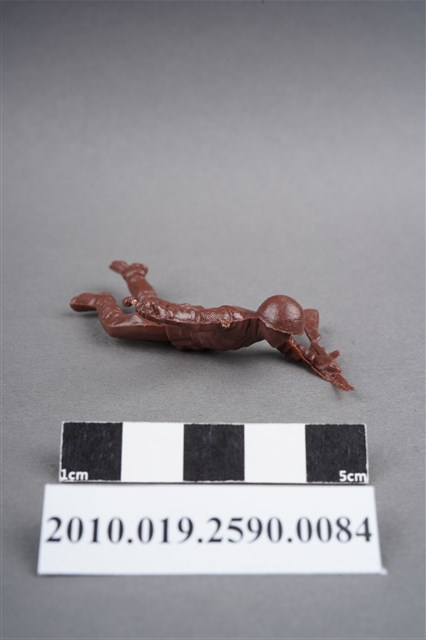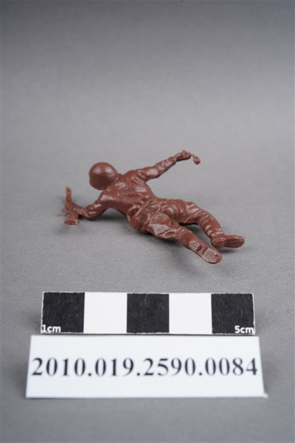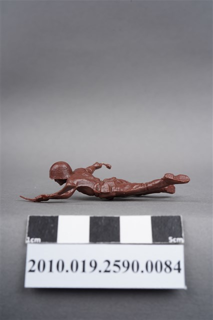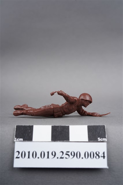 1.本物件為紅色步兵造型玩具士兵,寬約3公分,長約為6公分,為塑膠材質。外型為步兵,士兵頭戴鋼盔,身著軍服,腰帶上有彈袋,腳著軍靴,右肩有射出痕。士兵為匍匐前進姿,左手持步槍,步槍呈彎曲狀。右手上揚正要拋擲手雷。下腹處有一圓形痕。物件兩側可見射出接縫線。本系列玩具士兵多為相同塑膠模版,僅有顏色不同,或是同色同塑膠模版等形式。2.1938年美國玩具公司Bergen Toy and Novelty Co.開始銷售廉價的塑膠微型單色士兵系列,高約2英寸,各有不同的作戰姿勢及工具武器,美軍部分參照美軍部隊使用了軍綠色,之後推出灰色的德軍部隊及黃色的日軍部隊。1950年代因塑膠製造業的蓬勃發展,以及鉛中毒的恐慌,使得塑膠製且價格低廉的玩具士兵取代昂貴的彩繪金屬士兵,並定型為目前廣為人知的二戰系列。除了士兵系列外,市面上亦能見到牛仔與印地安人、太空人、騎士、恐龍、消防員、警察等各種角色。
