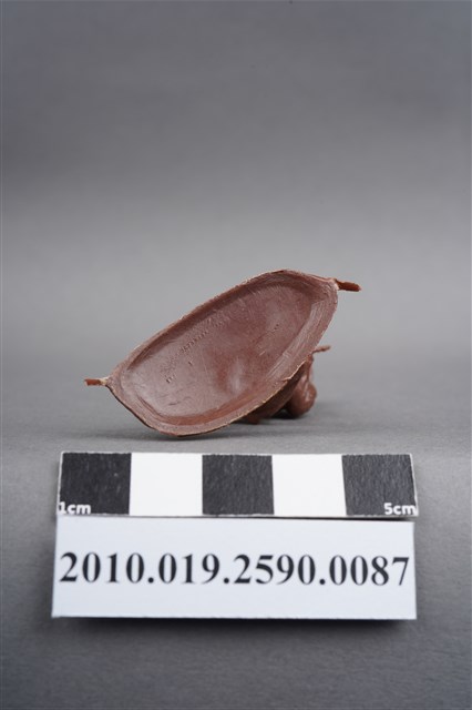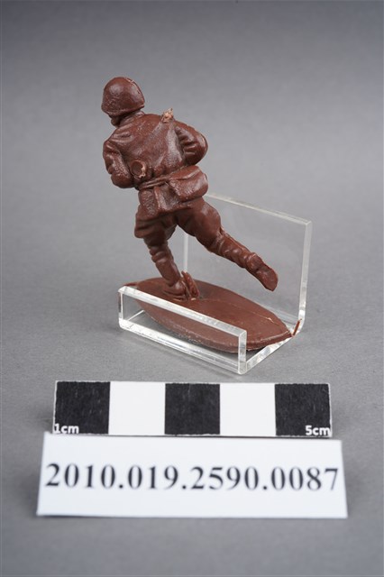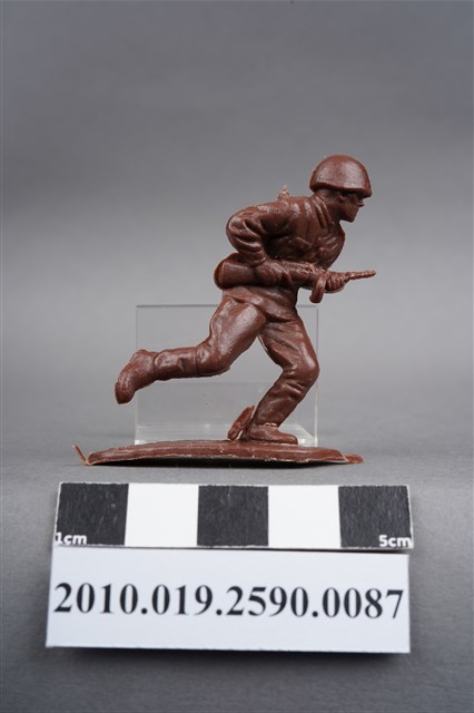 1.本物件為紅色步兵造型玩具士兵,高約4公分,寬約為3公分,為塑膠材質。外型為步兵,士兵頭戴鋼盔,身著軍服,腰帶上有腰袋,腳著軍靴。雙手持衝鋒槍於胸前,為奔跑姿。右肩有射出痕,左背近腰處有一圓形痕,左腳鞋跟有殘膠。物件整體底部連接著稱為「pod feet」的底板,底板底部為下凹式構造,邊緣及底部有殘膠及磨損情況。物件兩側可見射出接縫線。本系列玩具士兵多為相同塑膠模版,僅有顏色不同,或是同色同塑膠模版等形式。2.1938年美國玩具公司Bergen Toy and Novelty Co.開始銷售廉價的塑膠微型單色士兵系列,高約2英寸,各有不同的作戰姿勢及工具武器,美軍部分參照美軍部隊使用了軍綠色,之後推出灰色的德軍部隊及黃色的日軍部隊。1950年代因塑膠製造業的蓬勃發展,以及鉛中毒的恐慌,使得塑膠製且價格低廉的玩具士兵取代昂貴的彩繪金屬士兵,並定型為目前廣為人知的二戰系列。除了士兵系列外,市面上亦能見到牛仔與印地安人、太空人、騎士、恐龍、消防員、警察等各種角色。