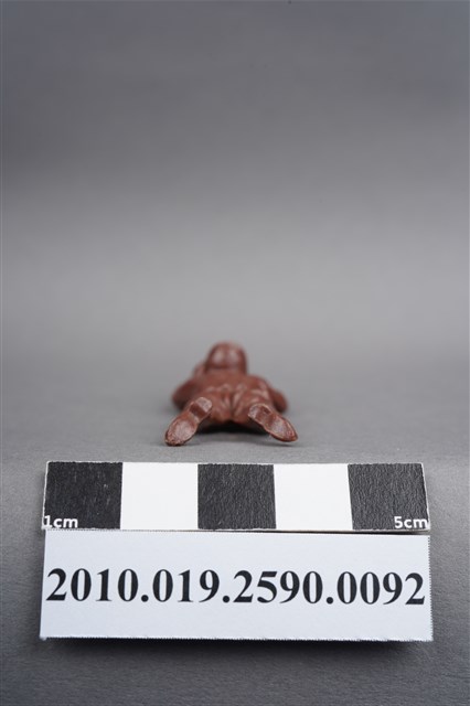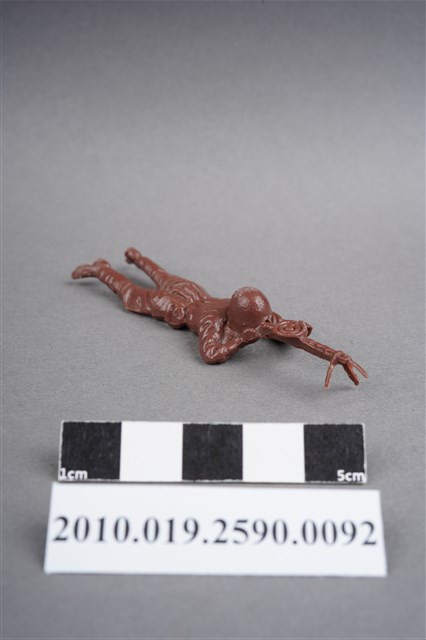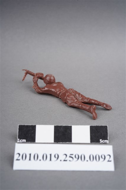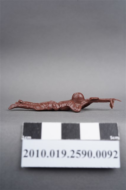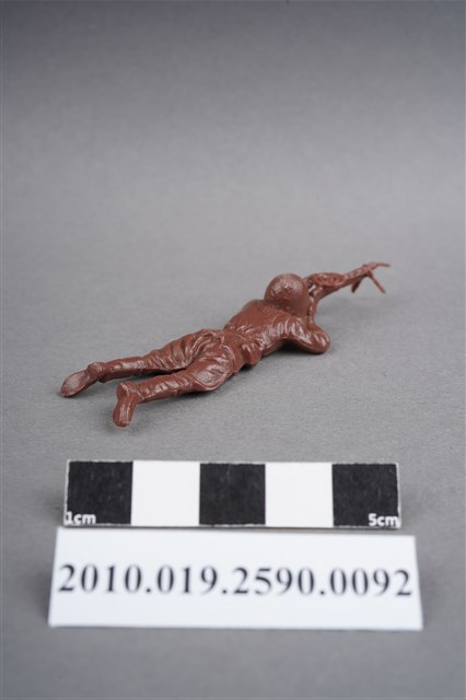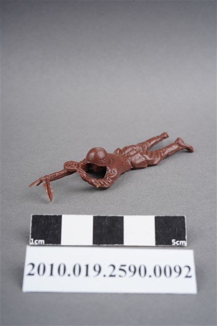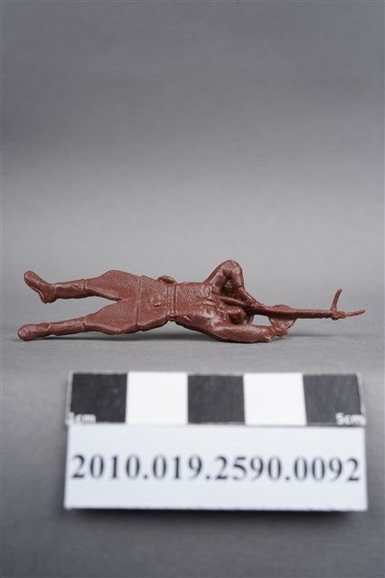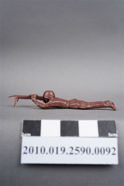 1.本物件為紅色狙擊兵造型玩具士兵,高約1.5公分,長約為6公分,為塑膠材質。外型為狙擊兵,士兵頭戴鋼盔,身著軍服,腰帶上有水壺,腳著軍靴,呈趴卧姿,雙手持握立於雙腳架上的狙擊槍,做瞄準貌。狙擊槍結構簡單,有多處殘膠。下腹部有圓形痕,左臂有射出痕。物件兩側可見射出接縫線。本系列玩具士兵多為相同塑膠模版,僅有顏色不同,或是同色同塑膠模版等形式。2.1938年美國玩具公司Bergen Toy and Novelty Co.開始銷售廉價的塑膠微型單色士兵系列,高約2英寸,各有不同的作戰姿勢及工具武器,美軍部分參照美軍部隊使用了軍綠色,之後推出灰色的德軍部隊及黃色的日軍部隊。1950年代因塑膠製造業的蓬勃發展,以及鉛中毒的恐慌,使得塑膠製且價格低廉的玩具士兵取代昂貴的彩繪金屬士兵,並定型為目前廣為人知的二戰系列。除了士兵系列外,市面上亦能見到牛仔與印地安人、太空人、騎士、恐龍、消防員、警察等各種角色。