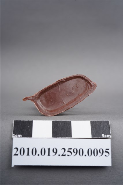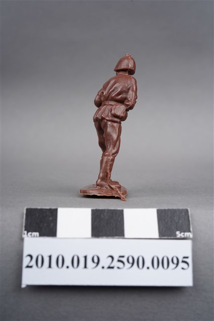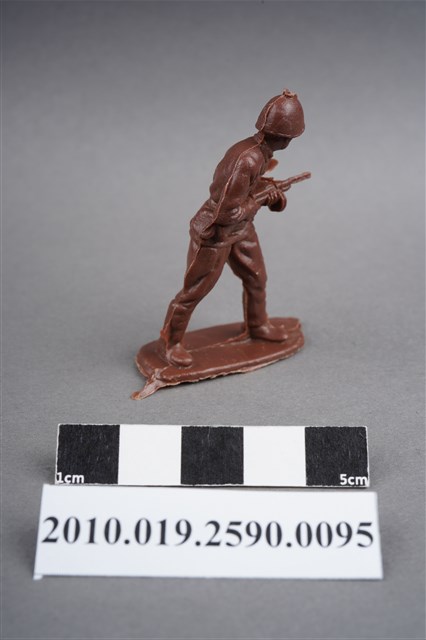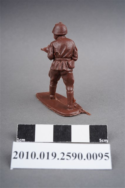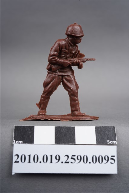 1.本物件為紅色步兵造型玩具士兵,高約5公分,寬約為4公分,為塑膠材質。外型為步兵,士兵頭戴鋼盔,身著軍服,腰帶有一腰袋,腳著軍靴,雙手持配置彈鼓的衝鋒槍,左背部有一圓形痕,左手肘處有一片殘膠。物件整體底部連接著稱為「pod feet」的底板,底板底部為下凹式構造,邊緣有磨損、溢膠及一圓形痕,內部有一圓形痕及一長條痕。物件兩側可見射出接縫線。本系列玩具士兵多為相同塑膠模版,僅有顏色不同,或是同色同塑膠模版等形式。2.1938年美國玩具公司Bergen Toy and Novelty Co.開始銷售廉價的塑膠微型單色士兵系列,高約2英寸,各有不同的作戰姿勢及工具武器,美軍部分參照美軍部隊使用了軍綠色,之後推出灰色的德軍部隊及黃色的日軍部隊。1950年代因塑膠製造業的蓬勃發展,以及鉛中毒的恐慌,使得塑膠製且價格低廉的玩具士兵取代昂貴的彩繪金屬士兵,並定型為目前廣為人知的二戰系列。除了士兵系列外,市面上亦能見到牛仔與印地安人、太空人、騎士、恐龍、消防員、警察等各種角色。