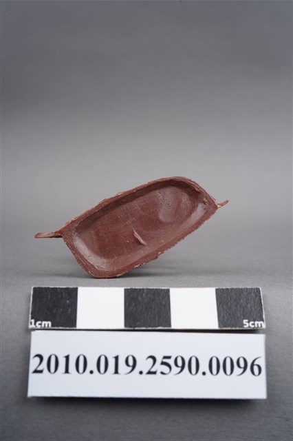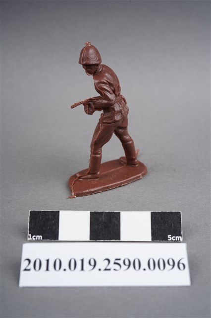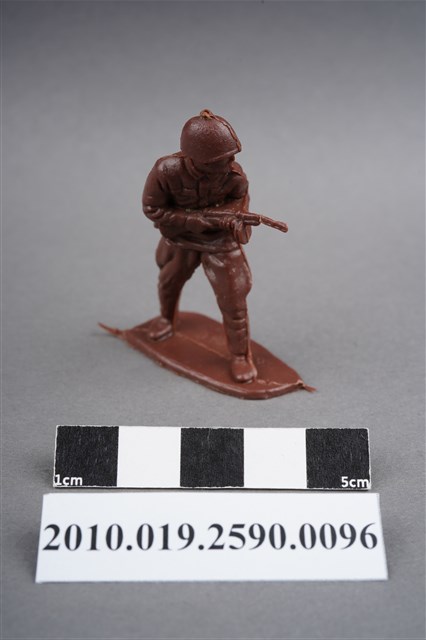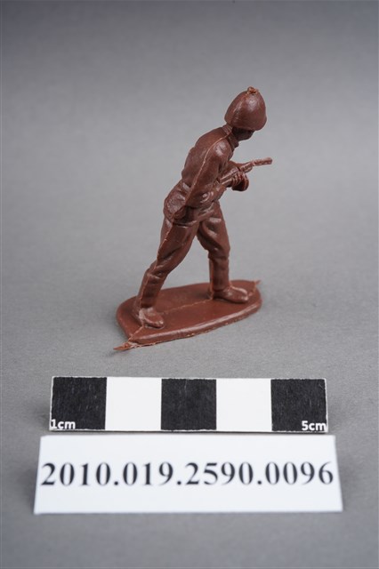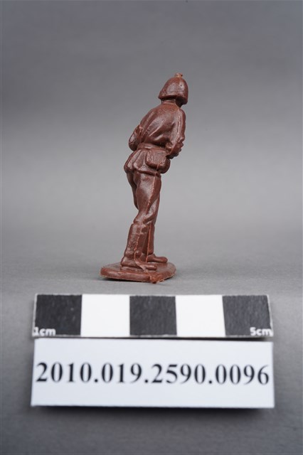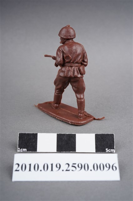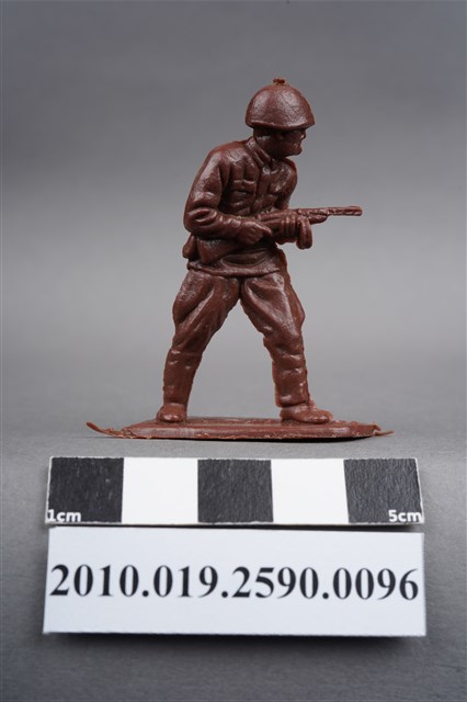 1.本物件為紅色步兵造型玩具士兵,高約5公分,寬約為4公分,為塑膠材質。外型為步兵,士兵頭戴鋼盔,身著軍服,腰帶有一腰袋,腳著軍靴,雙手持配置彈鼓的衝鋒槍,左背部有一圓形痕。物件整體底部連接著稱為「pod feet」的底板,底板底部為下凹式構造,邊緣有磨損及溢膠,內部有突出痕。物件兩側可見射出接縫線。本系列玩具士兵多為相同塑膠模版,僅有顏色不同,或是同色同塑膠模版等形式。2.1938年美國玩具公司Bergen Toy and Novelty Co.開始銷售廉價的塑膠微型單色士兵系列,高約2英寸,各有不同的作戰姿勢及工具武器,美軍部分參照美軍部隊使用了軍綠色,之後推出灰色的德軍部隊及黃色的日軍部隊。1950年代因塑膠製造業的蓬勃發展,以及鉛中毒的恐慌,使得塑膠製且價格低廉的玩具士兵取代昂貴的彩繪金屬士兵,並定型為目前廣為人知的二戰系列。除了士兵系列外,市面上亦能見到牛仔與印地安人、太空人、騎士、恐龍、消防員、警察等各種角色。