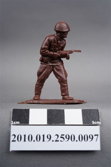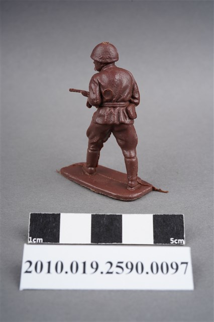 1.本物件為紅色步兵造型玩具士兵,高約5公分,寬約為4公分,為塑膠材質。外型為步兵,士兵頭戴鋼盔,身著軍服,腰帶有一腰袋,腳著軍靴,雙手持配置彈鼓的衝鋒槍,左背部有一圓形痕。物件整體底部連接著稱為「pod feet」的底板,底板底部為下凹式構造,邊緣有污痕磨損及溢膠,內部有突出痕及磨刮痕。物件兩側可見射出接縫線。本系列玩具士兵多為相同塑膠模版,僅有顏色不同,或是同色同塑膠模版等形式。2.1938年美國玩具公司Bergen Toy and Novelty Co.開始銷售廉價的塑膠微型單色士兵系列,高約2英寸,各有不同的作戰姿勢及工具武器,美軍部分參照美軍部隊使用了軍綠色,之後推出灰色的德軍部隊及黃色的日軍部隊。1950年代因塑膠製造業的蓬勃發展,以及鉛中毒的恐慌,使得塑膠製且價格低廉的玩具士兵取代昂貴的彩繪金屬士兵,並定型為目前廣為人知的二戰系列。除了士兵系列外,市面上亦能見到牛仔與印地安人、太空人、騎士、恐龍、消防員、警察等各種角色。
