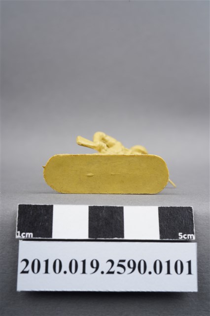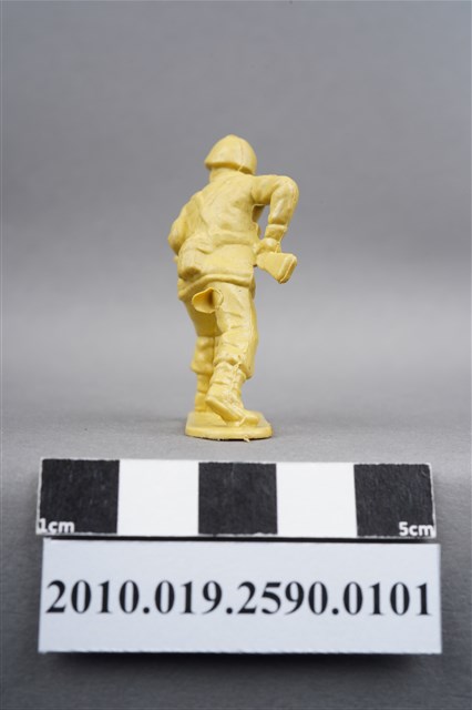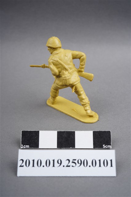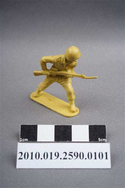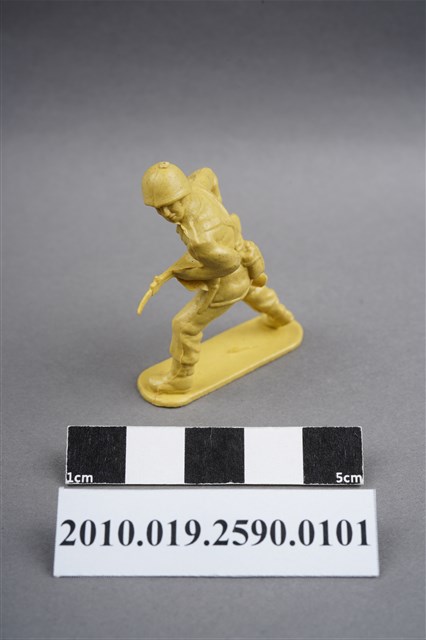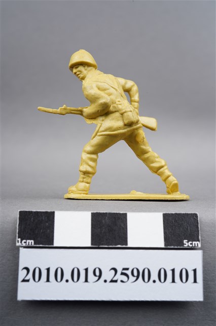 1.本物件為黃色步槍兵造型玩具士兵,高約4.5公分,寬約為3公分,為塑膠材質。外型為步槍兵,士兵頭戴鋼盔,身著軍服,腰帶上有彈袋、水壺及刺刀刀鞘,腳著軍靴,雙手持步槍呈行走姿,步槍前端已上刺刀。右大腿後側有一圓形痕,邊緣有突出之殘膠。物件整體底部連接著稱為「pod feet」的底板,底板底部平整有兩道凸痕,邊緣有磨損情況。物件兩側可見射出接縫線。本系列玩具士兵多為相同塑膠模版,僅有顏色不同,或是同色同塑膠模版等形式。