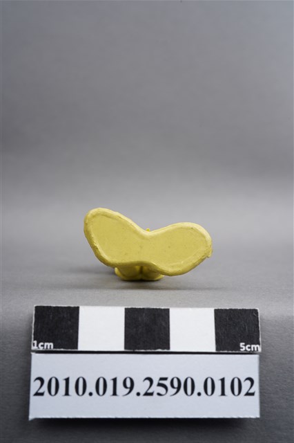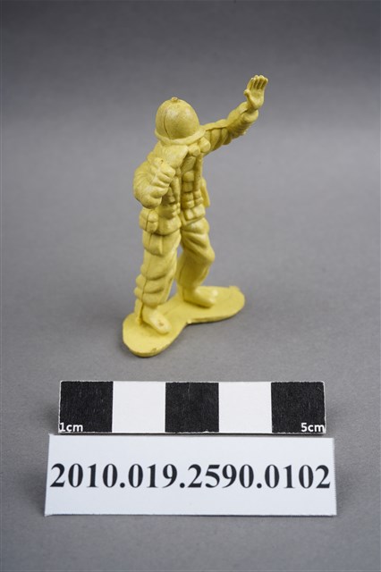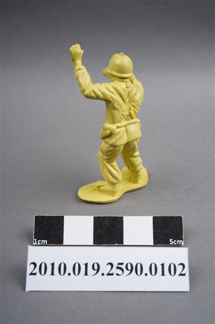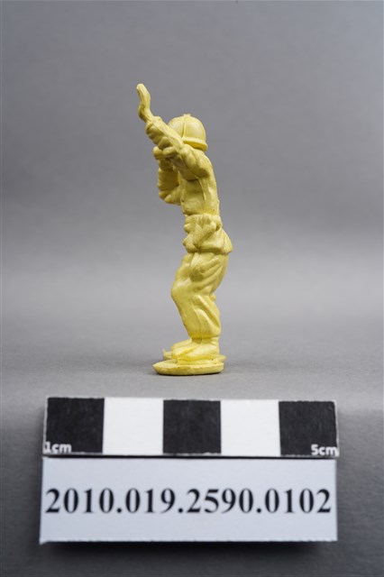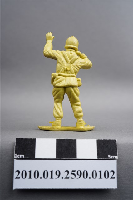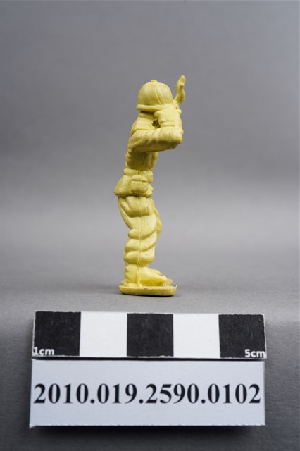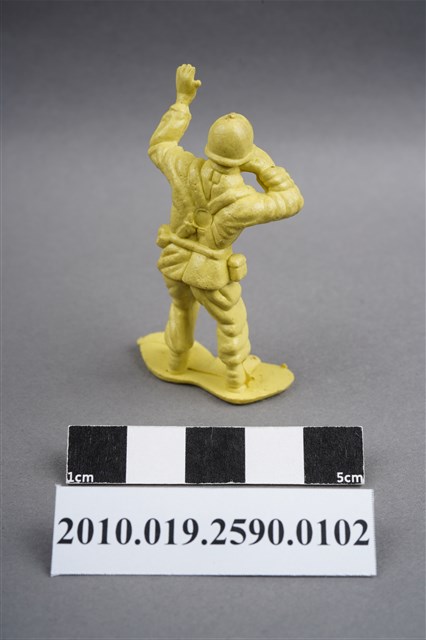 1.本物件為黃色通訊兵造型玩具士兵,高約5公分,寬約為3.5公分,為塑膠材質。外型為通訊兵,士兵頭戴鋼盔,身著軍服,腰帶上有彈袋、水壺及槍袋,腳著軍靴。右手持雙筒望遠鏡於眼前,左手高舉似向前方人員指示。背部有一圓形痕,兩腳前端有溢膠而不平整。物件整體底部連接著稱為「pod feet」的底板,底板底部平整,邊緣微凸。物件兩側可見射出接縫線,整體有污損及磨損情況。本系列玩具士兵多為相同塑膠模版,僅有顏色不同,或是同色同塑膠模版等形式。