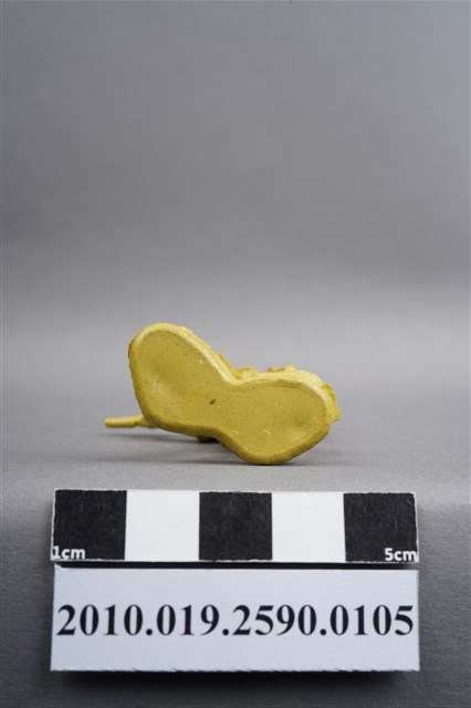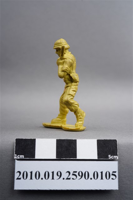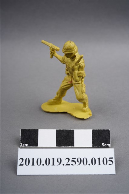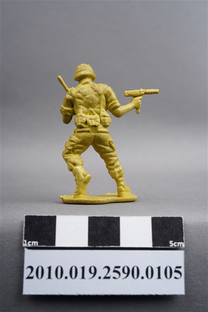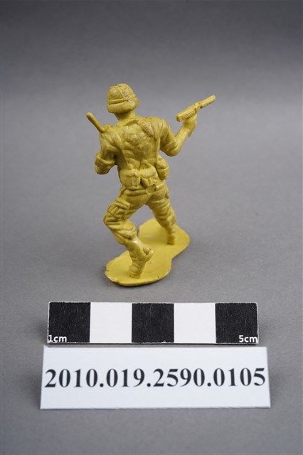 1.本物件為黃色步兵造型玩具士兵,高約4公分,寬約3公分,為塑膠材質。外型為步兵,士兵頭戴鋼盔,身著軍服,胸前有數個彈袋,腰帶上有水壺及彈袋之類的物品,腳著軍靴,右手持似衝鋒槍或裝有消音管之手槍,右手拿著疑似無線電的物品,呈行走姿。後腰處有一圓形痕。物件整體底部連接著稱為「pod feet」的底板,底板底部平整有污損情況,邊緣則有磨損痕跡跟溢膠。物件兩側可見射出接縫線,整體有多處髒污跟磨損處,跨下長褲折痕填塞有粉紅色沙狀顆粒。本系列玩具士兵多為相同塑膠模版,僅有顏色不同,或是同色同塑膠模版等形式。2.1938年美國玩具公司Bergen Toy and Novelty Co.開始銷售廉價的塑膠微型單色士兵系列,高約2英寸,各有不同的作戰姿勢及工具武器,美軍部分參照美軍部隊使用了軍綠色,之後推出灰色的德軍部隊及黃色的日軍部隊。1950年代因塑膠製造業的蓬勃發展,以及鉛中毒的恐慌,使得塑膠製且價格低廉的玩具士兵取代昂貴的彩繪金屬士兵,並定型為目前廣為人知的二戰系列。除了士兵系列外,市面上亦能見到牛仔與印地安人、太空人、騎士、恐龍、消防員、警察等各種角色。
