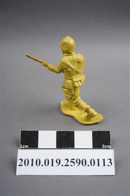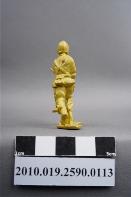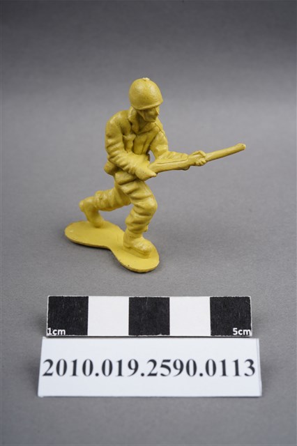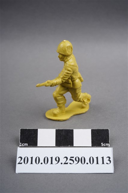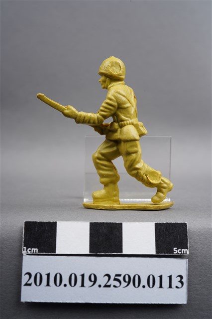 1.本物件為黃色步兵造型玩具士兵,高約4.5公分,寬約為4.5公分,為塑膠材質。外型為步兵,士兵頭戴鋼盔,身著軍服,腰帶上有彈袋及水壺,腳著軍靴,雙手持步槍,呈行走姿。鋼盔左後方有一凹痕,左小腿外側有圓形痕,邊緣有殘膠,右上背處有一塊紅色污痕。物件整體底部連接著稱為「pod feet」的底板,底板邊緣及上方有殘膠,底部有磨刮痕及紅色污漬。物件兩側可見射出接縫線。本系列玩具士兵多為相同塑膠模版,僅有顏色不同,或是同色同塑膠模版等形式。2.1938年美國玩具公司Bergen Toy and Novelty Co.開始銷售廉價的塑膠微型單色士兵系列,高約2英寸,各有不同的作戰姿勢及工具武器,美軍部分參照美軍部隊使用了軍綠色,之後推出灰色的德軍部隊及黃色的日軍部隊。1950年代因塑膠製造業的蓬勃發展,以及鉛中毒的恐慌,使得塑膠製且價格低廉的玩具士兵取代昂貴的彩繪金屬士兵,並定型為目前廣為人知的二戰系列。除了士兵系列外,市面上亦能見到牛仔與印地安人、太空人、騎士、恐龍、消防員、警察等各種角色。