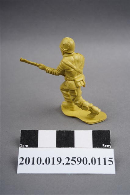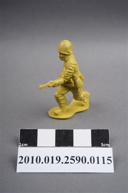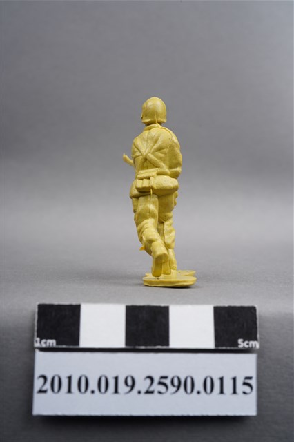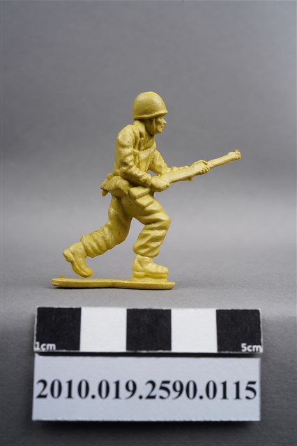 1.本物件為黃色步兵造型玩具士兵,高約4.5公分,寬約為4.5公分,為塑膠材質。外型為步兵,士兵頭戴鋼盔,身著軍服,腰帶上有彈袋及水壺,腳著軍靴,雙手持步槍,呈行走姿。鋼盔左後方及左小腿外側有圓形痕,邊緣有些微殘膠。物件整體底部連接著稱為「pod feet」的底板,底板邊緣及上方有殘膠,底部有磨刮痕。物件兩側可見射出接縫線。本系列玩具士兵多為相同塑膠模版,僅有顏色不同,或是同色同塑膠模版等形式。2.1938年美國玩具公司Bergen Toy and Novelty Co.開始銷售廉價的塑膠微型單色士兵系列,高約2英寸,各有不同的作戰姿勢及工具武器,美軍部分參照美軍部隊使用了軍綠色,之後推出灰色的德軍部隊及黃色的日軍部隊。1950年代因塑膠製造業的蓬勃發展,以及鉛中毒的恐慌,使得塑膠製且價格低廉的玩具士兵取代昂貴的彩繪金屬士兵,並定型為目前廣為人知的二戰系列。除了士兵系列外,市面上亦能見到牛仔與印地安人、太空人、騎士、恐龍、消防員、警察等各種角色。
