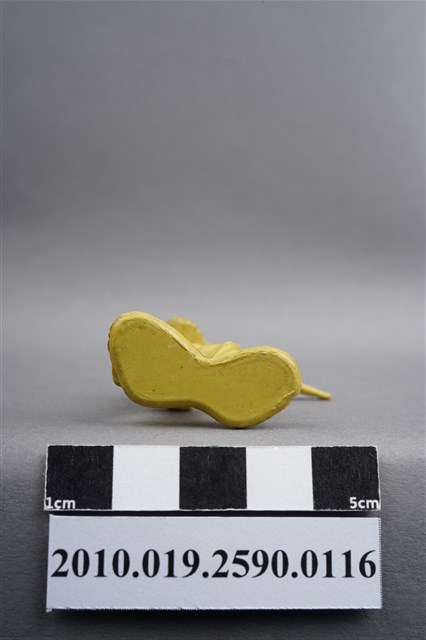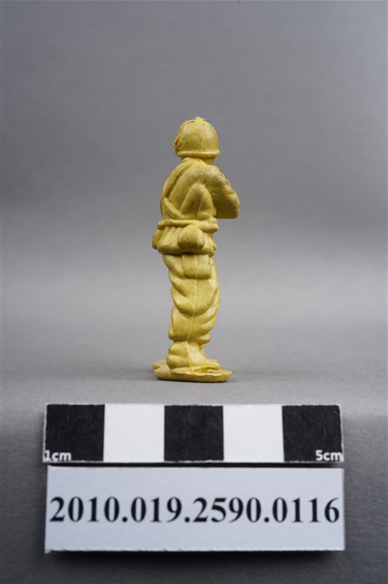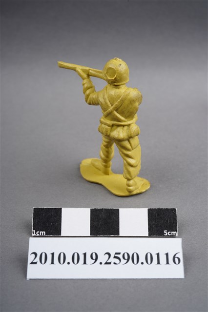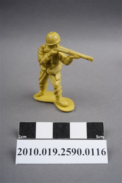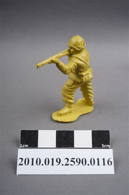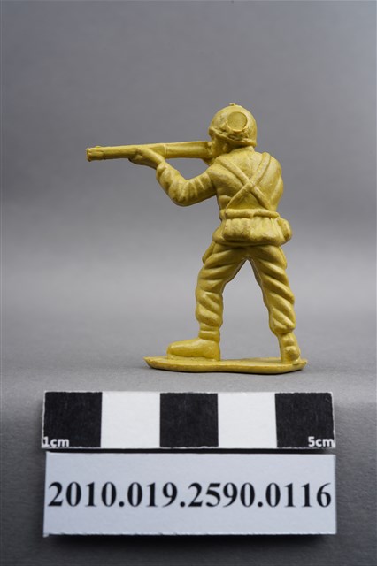 1.本物件為黃色步兵造型玩具士兵,高約4.5公分,寬約為4公分,為塑膠材質。外型為步兵,士兵頭戴鋼盔,身著軍服,腰帶上有彈袋、水壺及腰袋,腳著軍靴,雙手平舉步槍瞄準前方。鋼盔左偏後方有一圓形痕,略呈凹陷。物件整體底部連接著稱為「pod feet」的底板,底板底部有磨刮痕跟黑色污漬。物件兩側可見射出接縫線。本系列玩具士兵多為相同塑膠模版,僅有顏色不同,或是同色同塑膠模版等形式。2.1938年美國玩具公司Bergen Toy and Novelty Co.開始銷售廉價的塑膠微型單色士兵系列,高約2英寸,各有不同的作戰姿勢及工具武器,美軍部分參照美軍部隊使用了軍綠色,之後推出灰色的德軍部隊及黃色的日軍部隊。1950年代因塑膠製造業的蓬勃發展,以及鉛中毒的恐慌,使得塑膠製且價格低廉的玩具士兵取代昂貴的彩繪金屬士兵,並定型為目前廣為人知的二戰系列。除了士兵系列外,市面上亦能見到牛仔與印地安人、太空人、騎士、恐龍、消防員、警察等各種角色。