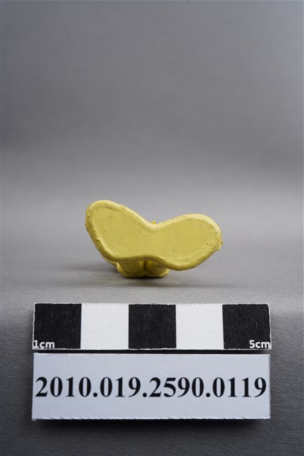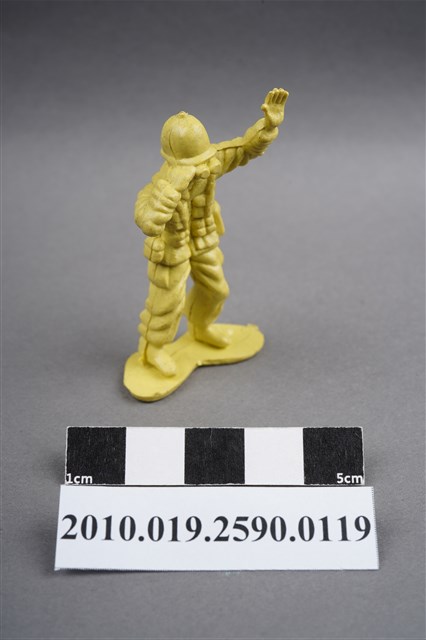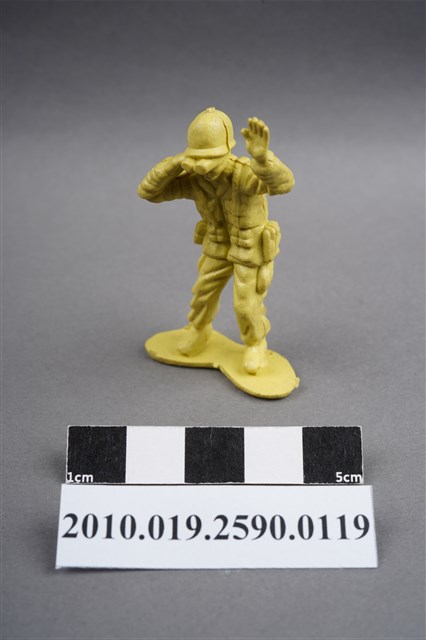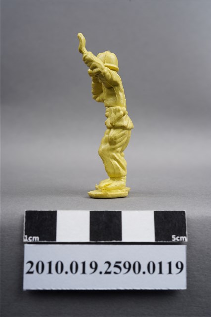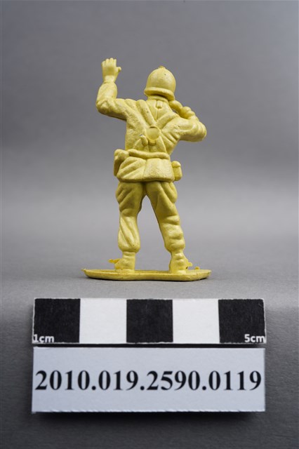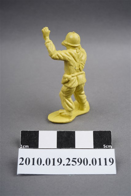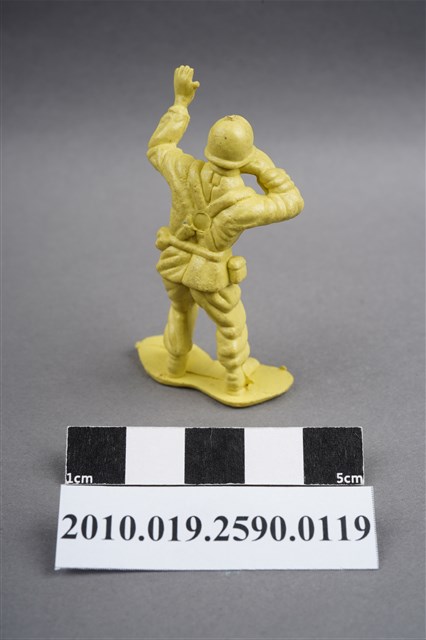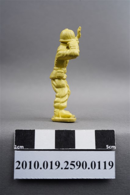 1.本物件為黃色通訊兵造型玩具士兵,高約5公分,寬約為3.5公分,為塑膠材質。外型為通訊兵,士兵頭戴鋼盔,身著軍服,腰帶上有彈袋、水壺及槍袋,腳著軍靴。右手持雙筒望遠鏡於眼前,左手高舉似向前方人員指示。背部有一圓形痕,圓形痕左下方有埴膠不足造成的凹陷處,兩腳邊有溢膠而不平整。物件整體底部連接著稱為「pod feet」的底板,底板底部平整,邊緣微凸且有污痕。物件兩側可見射出接縫線,整體有污損及磨損情況。本系列玩具士兵多為相同塑膠模版,僅有顏色不同,或是同色同塑膠模版等形式。
