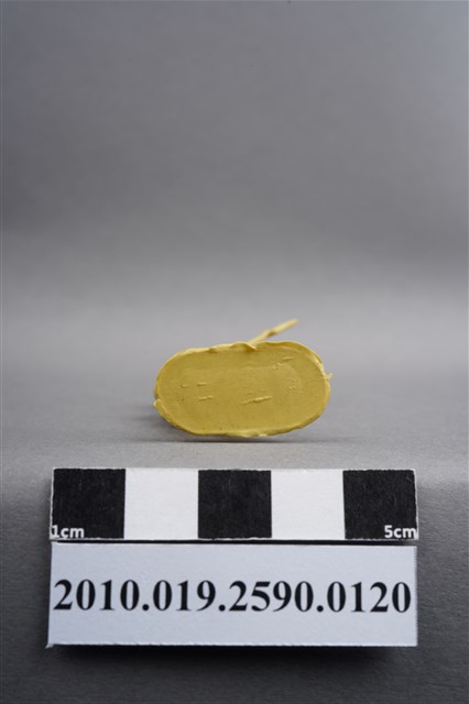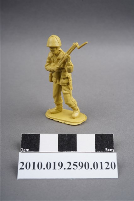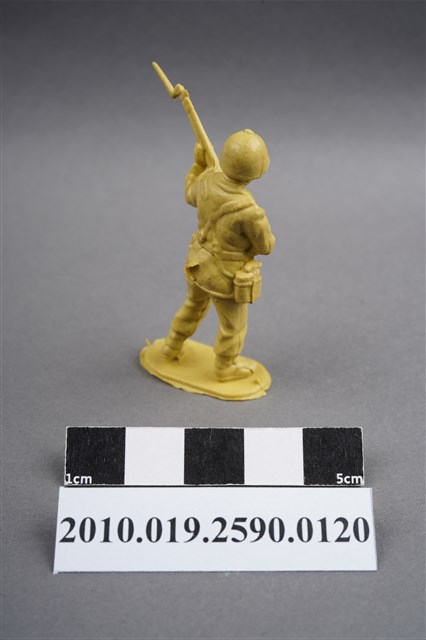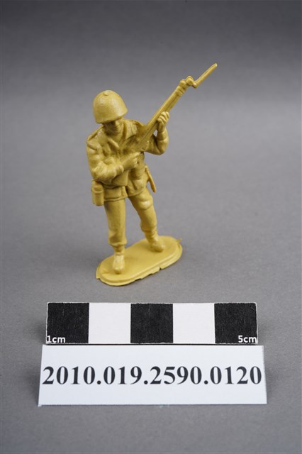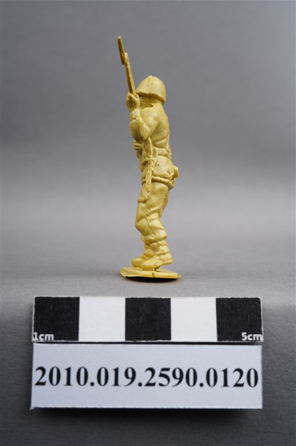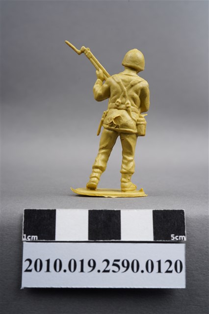1.本物件為黃色步兵造型玩具士兵,高約5公分,寬約為3公分,為塑膠材質。外型為步兵,士兵頭戴鋼盔,身著軍服,腰帶上有彈袋、水壺及刺刀刀鞘,腳著軍靴,雙手斜舉步槍,步槍頂端已上刺刀。臀部有一圓形痕,邊緣有殘膠,且左臀、大腿部分,有數處填膠不足造成的不平整處。物件整體底部連接著稱為「pod feet」的底板,底板底部平整有不連續凸起痕,邊緣有溢膠磨損情況。物件兩側可見射出接縫線。本系列玩具士兵多為相同塑膠模版,僅有顏色不同,或是同色同塑膠模版等形式。2.1938年美國玩具公司Bergen Toy and Novelty Co.開始銷售廉價的塑膠微型單色士兵系列,高約2英寸,各有不同的作戰姿勢及工具武器,美軍部分參照美軍部隊使用了軍綠色,之後推出灰色的德軍部隊及黃色的日軍部隊。1950年代因塑膠製造業的蓬勃發展,以及鉛中毒的恐慌,使得塑膠製且價格低廉的玩具士兵取代昂貴的彩繪金屬士兵,並定型為目前廣為人知的二戰系列。除了士兵系列外,市面上亦能見到牛仔與印地安人、太空人、騎士、恐龍、消防員、警察等各種角色。