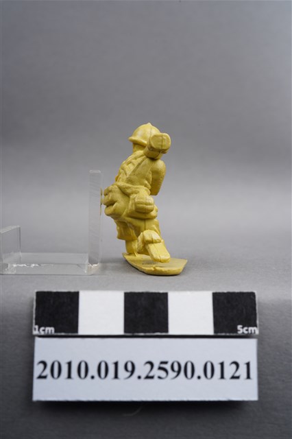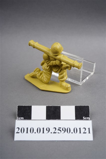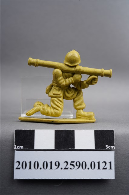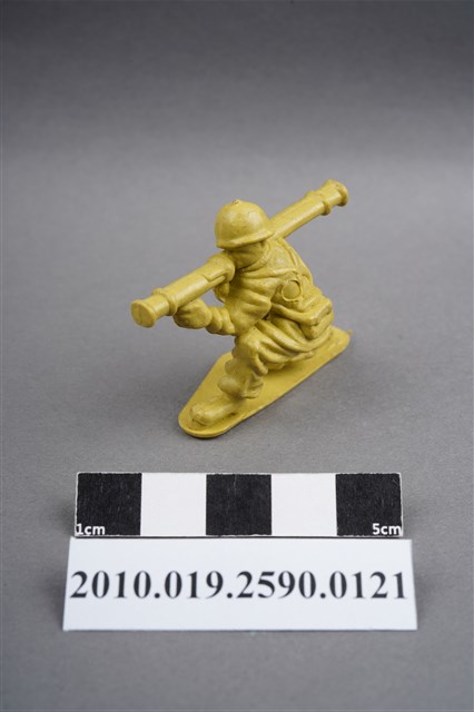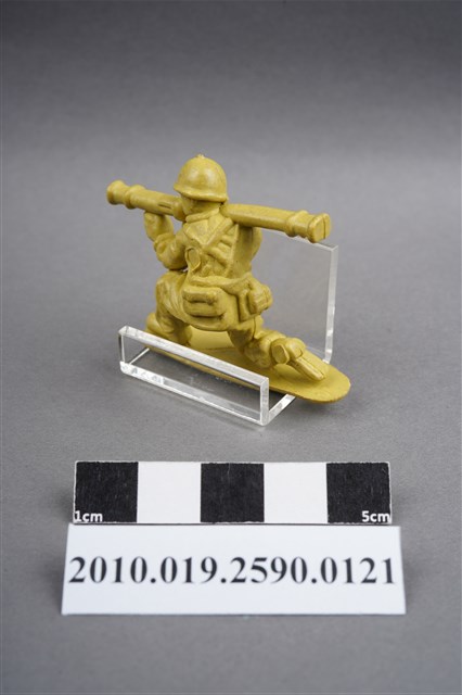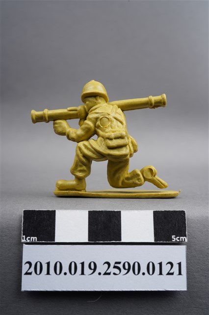 1.本物件為黃色步兵造型玩具士兵,高約3公分,寬約為5公分,為塑膠材質。外型為步兵,士兵頭戴鋼盔,身著軍服,腰帶上有彈袋、腰袋及水壺,腳著軍靴,單膝跪地,右腳虛浮於底板上,雙手持肩扛式火箭筒,呈瞄準姿。左背部及右腳內側各有一圓形痕。物件整體底部連接著稱為「pod feet」的底板,底板底部有數個凸起痕、磨刮痕及一片污痕,邊緣有溢膠磨損情況。物件兩側可見射出接縫線。本系列玩具士兵多為相同塑膠模版,僅有顏色不同,或是同色同塑膠模版等形式。2.1938年美國玩具公司Bergen Toy and Novelty Co.開始銷售廉價的塑膠微型單色士兵系列,高約2英寸,各有不同的作戰姿勢及工具武器,美軍部分參照美軍部隊使用了軍綠色,之後推出灰色的德軍部隊及黃色的日軍部隊。1950年代因塑膠製造業的蓬勃發展,以及鉛中毒的恐慌,使得塑膠製且價格低廉的玩具士兵取代昂貴的彩繪金屬士兵,並定型為目前廣為人知的二戰系列。除了士兵系列外,市面上亦能見到牛仔與印地安人、太空人、騎士、恐龍、消防員、警察等各種角色。