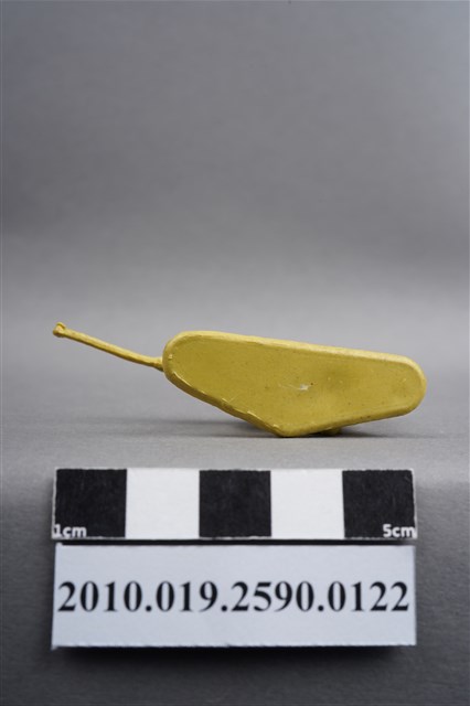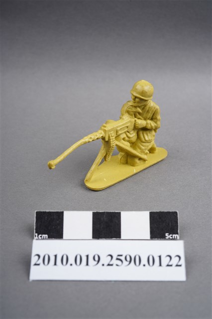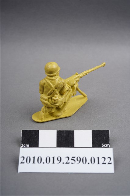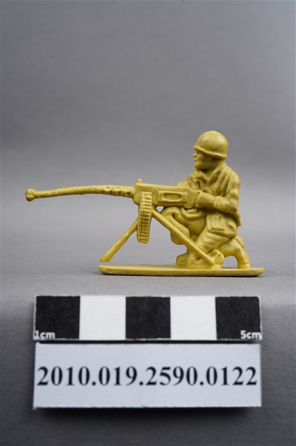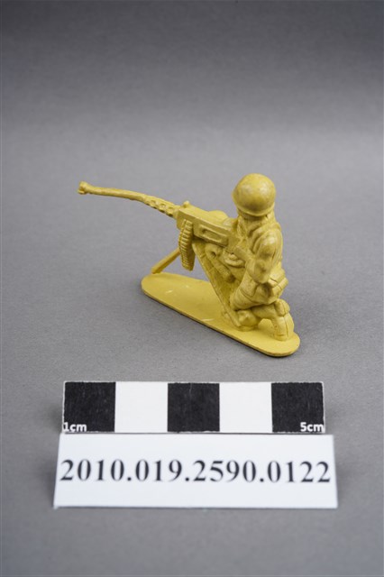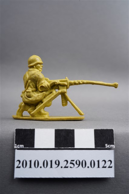 1.本物件為黃色機槍兵造型玩具士兵,高約4公分,長約為5.5公分,為塑膠材質。外型為機槍兵,士兵雙眼直視前方,頭戴鋼盔,身著軍服,腰帶上有彈袋、水壺及腰袋,腳著軍靴,右手肘部有一圓形痕,略呈凹陷。單膝蹲於機槍前,雙手置於架在三腳架的機槍上,機槍旁懸有一串彈鏈,三腳架底端懸空。整體底部連接著稱為「pod feet」的底板,底板底部平整,有一白色痕,邊緣有些微殘膠,物件兩側可見射出接縫線。本系列玩具士兵多為相同塑膠模版,僅有顏色不同,或是同色同塑膠模版等形式。2.1938年美國玩具公司Bergen Toy and Novelty Co.開始銷售廉價的塑膠微型單色士兵系列,高約2英寸,各有不同的作戰姿勢及工具武器,美軍部分參照美軍部隊使用了軍綠色,之後推出灰色的德軍部隊及黃色的日軍部隊。1950年代因塑膠製造業的蓬勃發展,以及鉛中毒的恐慌,使得塑膠製且價格低廉的玩具士兵取代昂貴的彩繪金屬士兵,並定型為目前廣為人知的二戰系列。除了士兵系列外,市面上亦能見到牛仔與印地安人、太空人、騎士、恐龍、消防員、警察等各種角色。