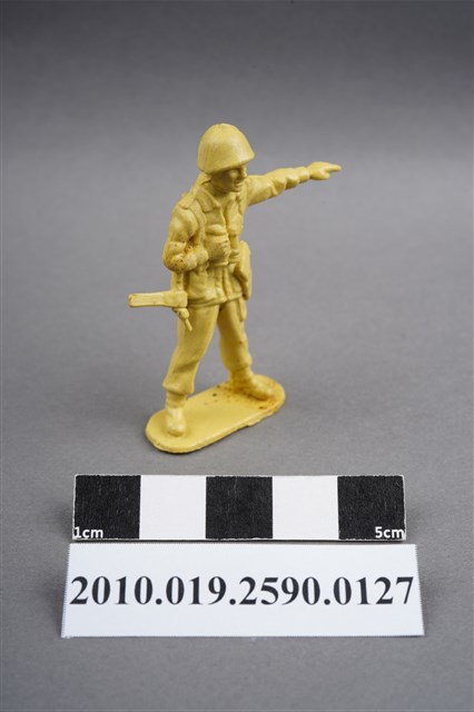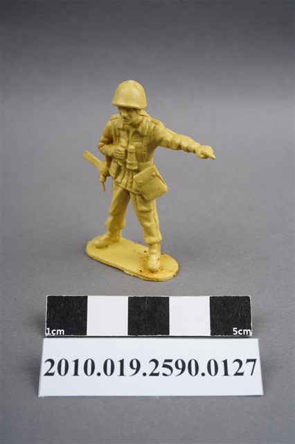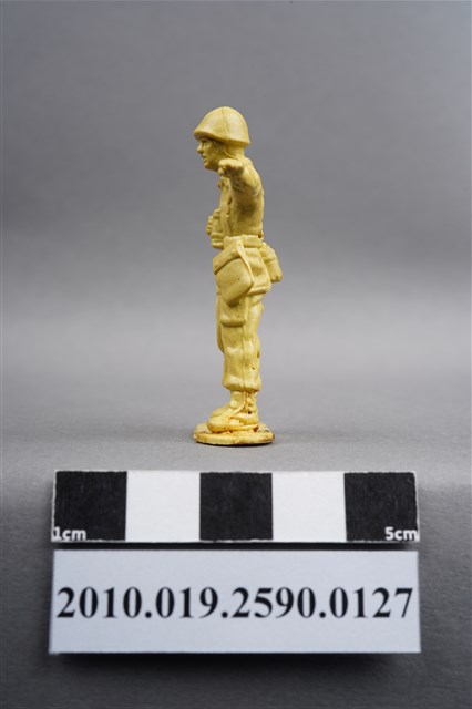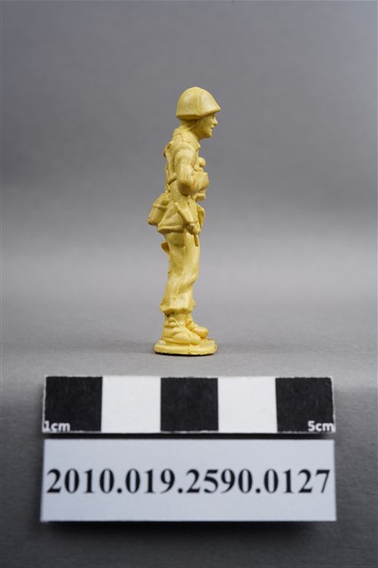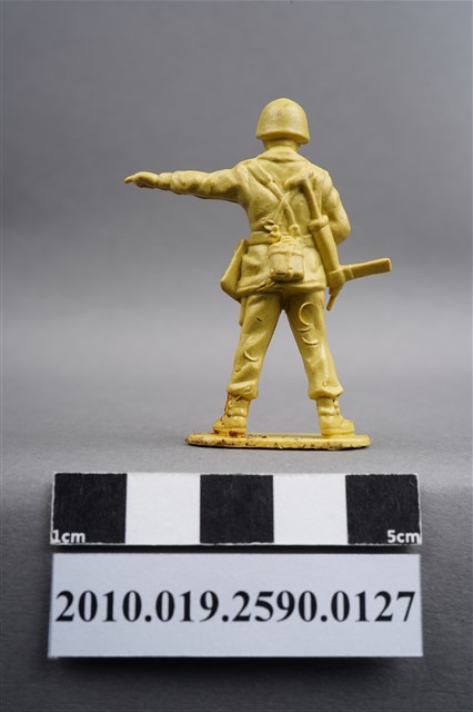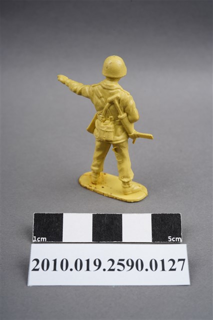 1.本物件為黃色通訊兵造型玩具士兵,高約5公分,寬約為3.5公分,為塑膠材質。外型為通訊兵,士兵頭戴鋼盔,身著軍服,腰帶上有彈袋、水壺及腰袋,腳著軍靴。衝鋒槍背掛於右肩,右手持雙筒望遠鏡,左手平舉指向左方。右大腿後側有一圓形痕,兩腳褲管後方有多道因填膠不足造成的凹痕。物件整體底部連接著稱為「pod feet」的底板,底板上方士兵左腳處及邊緣有大量污漬及磨損痕跡,底部有數道凸痕。物件兩側可見射出接縫線。物件整體有些微磨損痕跡。本系列玩具士兵多為相同塑膠模版,僅有顏色不同,或是同色同塑膠模版等形式。2.1938年美國玩具公司Bergen Toy and Novelty Co.開始銷售廉價的塑膠微型單色士兵系列,高約2英寸,各有不同的作戰姿勢及工具武器,美軍部分參照美軍部隊使用了軍綠色,之後推出灰色的德軍部隊及黃色的日軍部隊。1950年代因塑膠製造業的蓬勃發展,以及鉛中毒的恐慌,使得塑膠製且價格低廉的玩具士兵取代昂貴的彩繪金屬士兵,並定型為目前廣為人知的二戰系列。除了士兵系列外,市面上亦能見到牛仔與印地安人、太空人、騎士、恐龍、消防員、警察等各種角色。