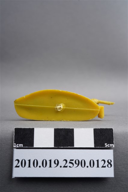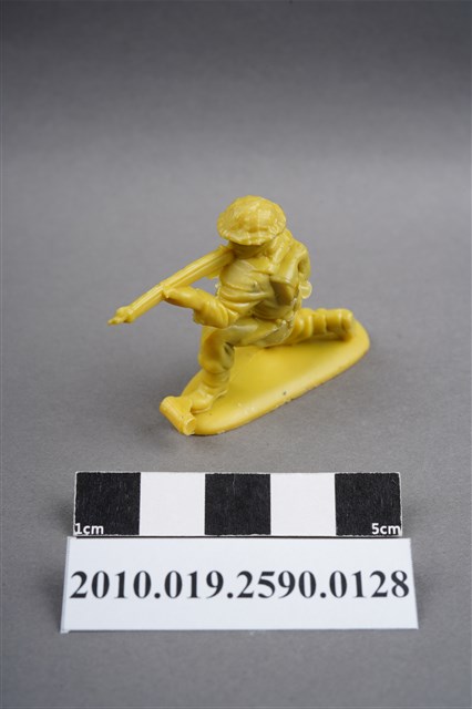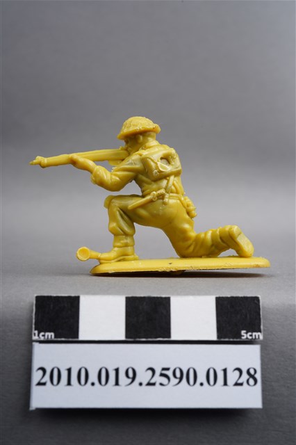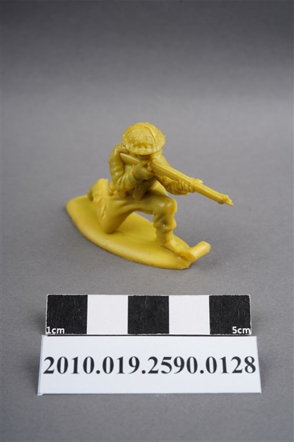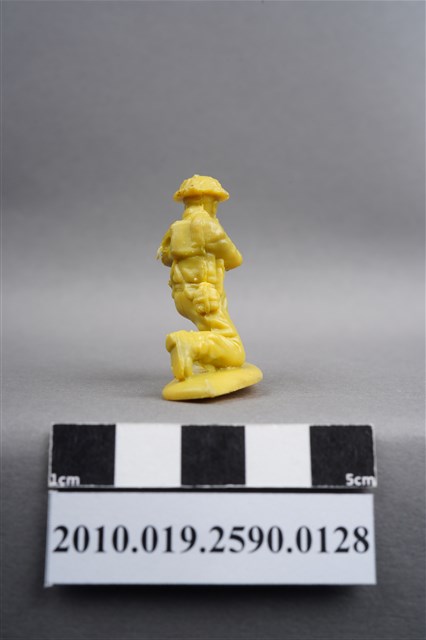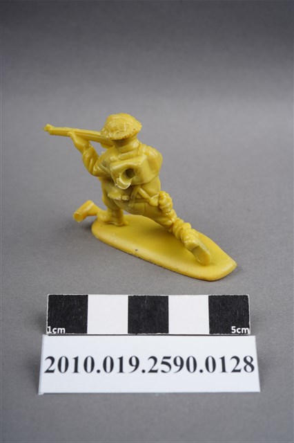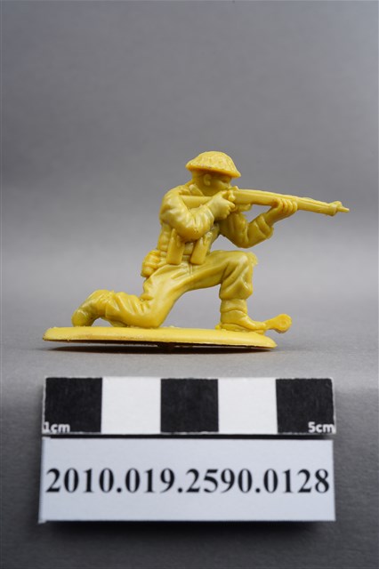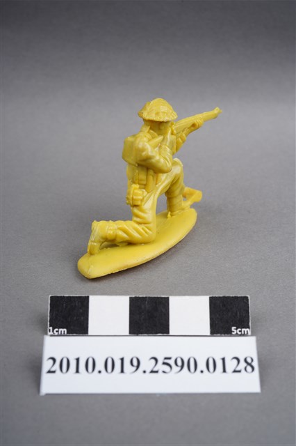 1.本物件為黃色步兵造型玩具士兵,高約4公分,長約為5.5公分,為塑膠材質。外型為步兵,士兵頭戴鋼盔,身著軍服,腰帶上有彈袋、水壺及刺刀,背上有背包,腳著軍靴,左腳前有射出之溢膠。單膝跪地,雙手持步槍瞄準前方。背包有射出痕,呈凹陷狀,邊緣有殘膠。物件整體底部連接著稱為「pod feet」的底板,底板底部有一射出痕及明顯接縫痕。物件兩側可見射出接縫線。本系列玩具士兵多為相同塑膠模版,僅有顏色不同,或是同色同塑膠模版等形式。2.1938年美國玩具公司Bergen Toy and Novelty Co.開始銷售廉價的塑膠微型單色士兵系列,高約2英寸,各有不同的作戰姿勢及工具武器,美軍部分參照美軍部隊使用了軍綠色,之後推出灰色的德軍部隊及黃色的日軍部隊。1950年代因塑膠製造業的蓬勃發展,以及鉛中毒的恐慌,使得塑膠製且價格低廉的玩具士兵取代昂貴的彩繪金屬士兵,並定型為目前廣為人知的二戰系列。除了士兵系列外,市面上亦能見到牛仔與印地安人、太空人、騎士、恐龍、消防員、警察等各種角色。