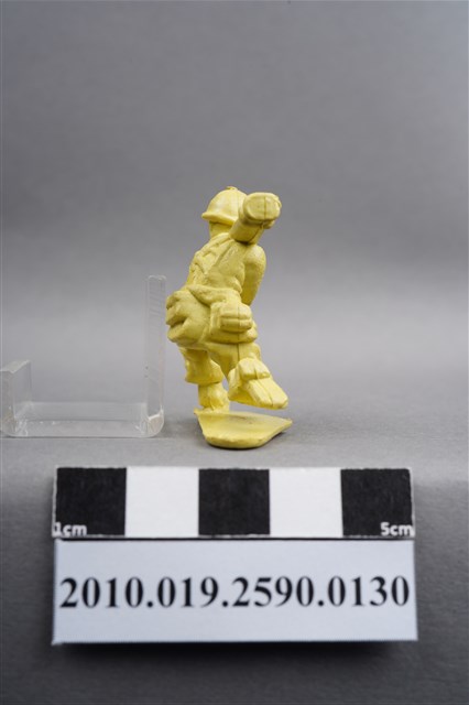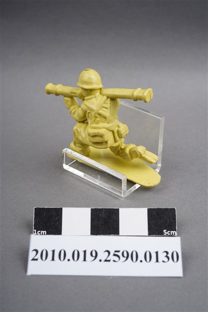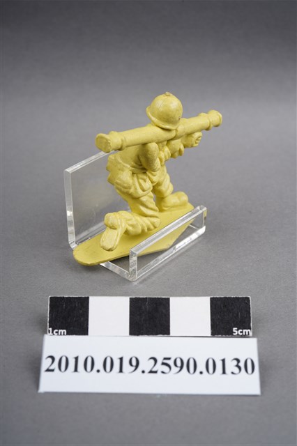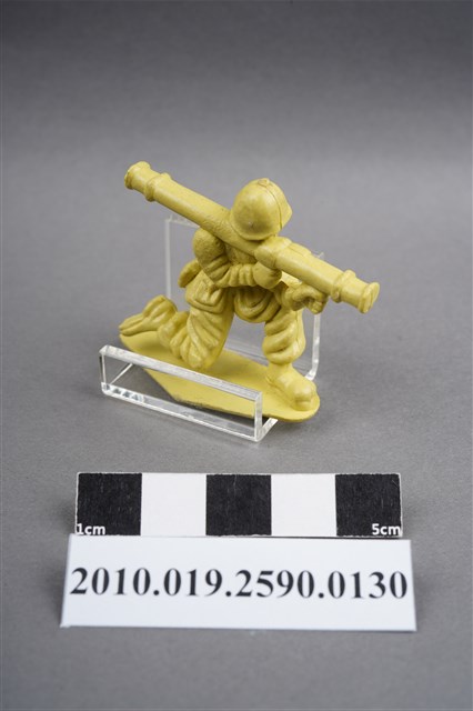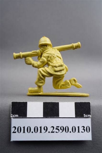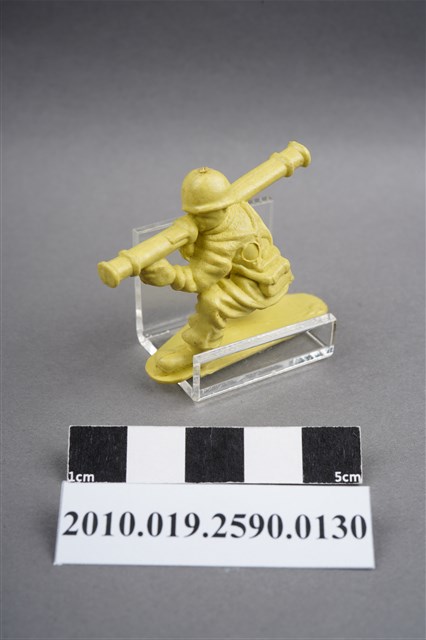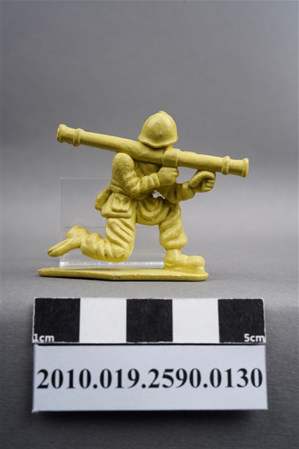 1.本物件為黃色步兵造型玩具士兵,高約3公分,寬約為5公分,為塑膠材質。外型為步兵,士兵頭戴鋼盔,身著軍服,腰帶上有彈袋、腰袋及水壺,腳著軍靴,單膝跪地,右腳虛浮於底板上,雙手持肩扛式火箭筒,呈瞄準姿。左背部及右腳內側各有一圓形痕。物件整體底部連接著稱為「pod feet」的底板,底板底部大致平整,有些微磨刮的痕跡。物件兩側可見射出接縫線。本系列玩具士兵多為相同塑膠模版,僅有顏色不同,或是同色同塑膠模版等形式。2.1938年美國玩具公司Bergen Toy and Novelty Co.開始銷售廉價的塑膠微型單色士兵系列,高約2英寸,各有不同的作戰姿勢及工具武器,美軍部分參照美軍部隊使用了軍綠色,之後推出灰色的德軍部隊及黃色的日軍部隊。1950年代因塑膠製造業的蓬勃發展,以及鉛中毒的恐慌,使得塑膠製且價格低廉的玩具士兵取代昂貴的彩繪金屬士兵,並定型為目前廣為人知的二戰系列。除了士兵系列外,市面上亦能見到牛仔與印地安人、太空人、騎士、恐龍、消防員、警察等各種角色。