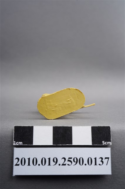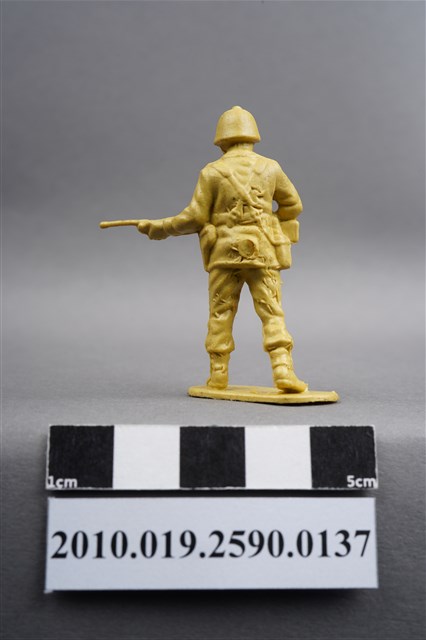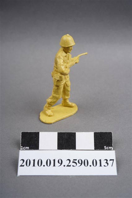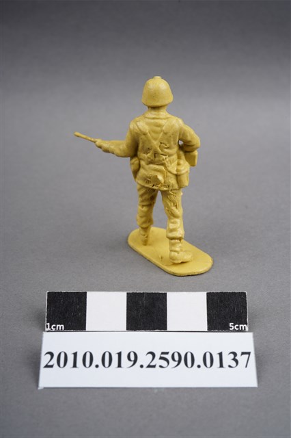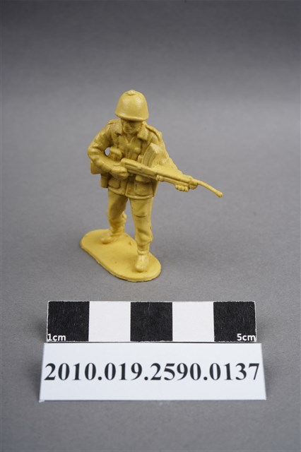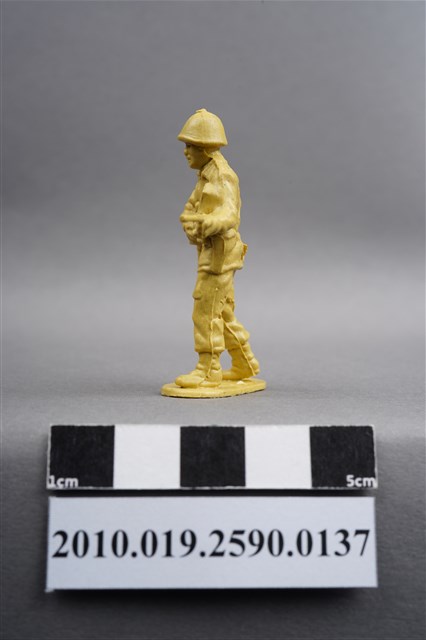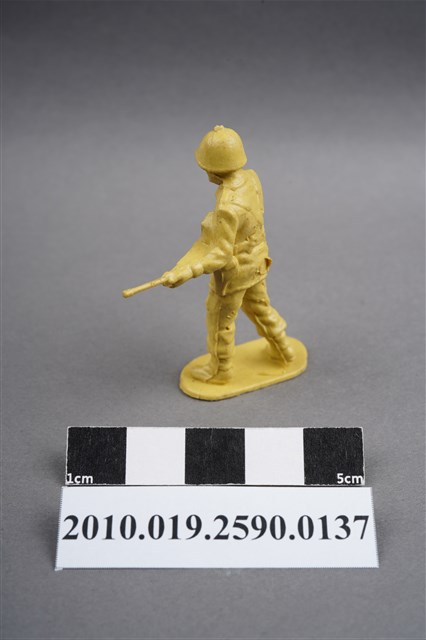 1.本物件為黃色步兵造型玩具士兵,高約5公分,寬約為4公分,為塑膠材質。外型為步兵,士兵頭戴鋼盔,身著軍服,腰帶上有彈袋及水壺,腳著軍靴,雙手平持步槍,左腳略向前跨。臀部有一圓形痕,邊緣有殘膠,背、臀及腿、腳後側,有許多填膠不足造成之不平整處。物件整體底部連接著稱為「pod feet」的底板,底板邊緣有殘膠,底部有數道凸痕。物件兩側可見射出接縫線。本系列玩具士兵多為相同塑膠模版,僅有顏色不同,或是同色同塑膠模版等形式。2.1938年美國玩具公司Bergen Toy and Novelty Co.開始銷售廉價的塑膠微型單色士兵系列,高約2英寸,各有不同的作戰姿勢及工具武器,美軍部分參照美軍部隊使用了軍綠色,之後推出灰色的德軍部隊及黃色的日軍部隊。1950年代因塑膠製造業的蓬勃發展,以及鉛中毒的恐慌,使得塑膠製且價格低廉的玩具士兵取代昂貴的彩繪金屬士兵,並定型為目前廣為人知的二戰系列。除了士兵系列外,市面上亦能見到牛仔與印地安人、太空人、騎士、恐龍、消防員、警察等各種角色。