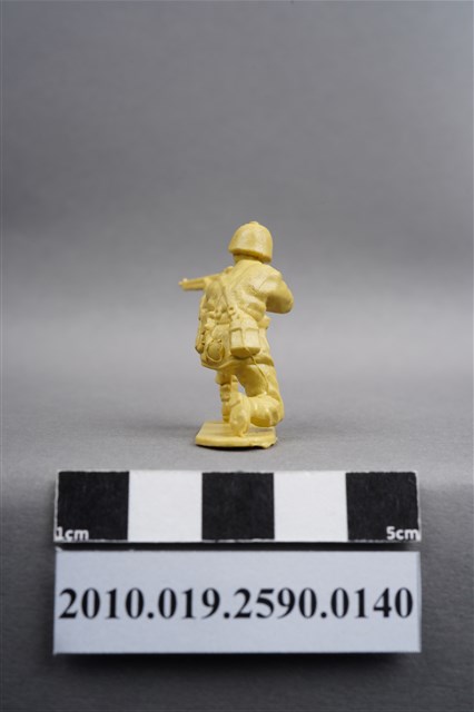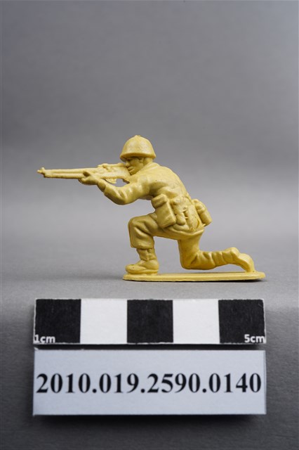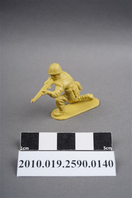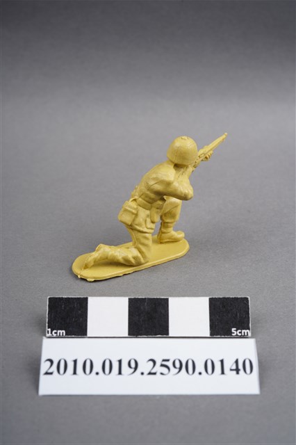 1.本物件為黃色步兵造型玩具士兵,高約4公分,長約為5.5公分,為塑膠材質。外型為步兵,士兵頭戴鋼盔,身著軍服,腰帶上有彈袋與水壺,腳著軍靴。單膝跪地,雙手持步槍瞄準前方。右臀有一射出痕,邊緣有些殘膠。物件整體底部連接著稱為「pod feet」的底板,底板邊緣有殘膠,底部有數道凸痕。物件兩側可見射出接縫線。本系列玩具士兵多為相同塑膠模版,僅有顏色不同,或是同色同塑膠模版等形式。2.1938年美國玩具公司Bergen Toy and Novelty Co.開始銷售廉價的塑膠微型單色士兵系列,高約2英寸,各有不同的作戰姿勢及工具武器,美軍部分參照美軍部隊使用了軍綠色,之後推出灰色的德軍部隊及黃色的日軍部隊。1950年代因塑膠製造業的蓬勃發展,以及鉛中毒的恐慌,使得塑膠製且價格低廉的玩具士兵取代昂貴的彩繪金屬士兵,並定型為目前廣為人知的二戰系列。除了士兵系列外,市面上亦能見到牛仔與印地安人、太空人、騎士、恐龍、消防員、警察等各種角色。