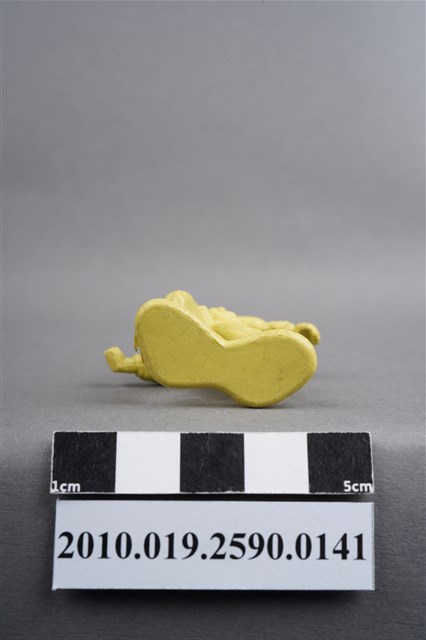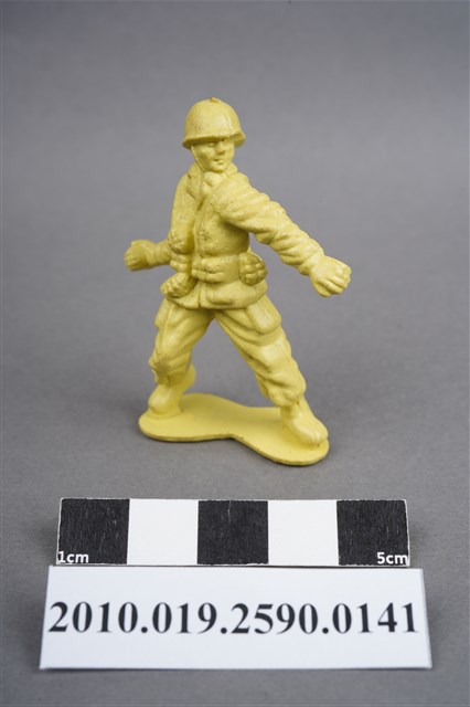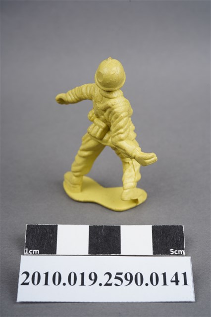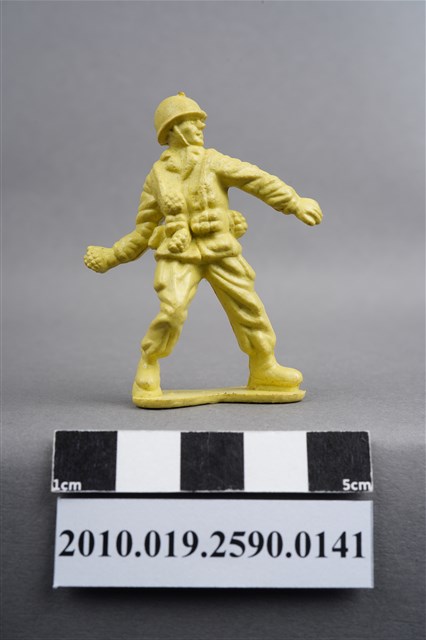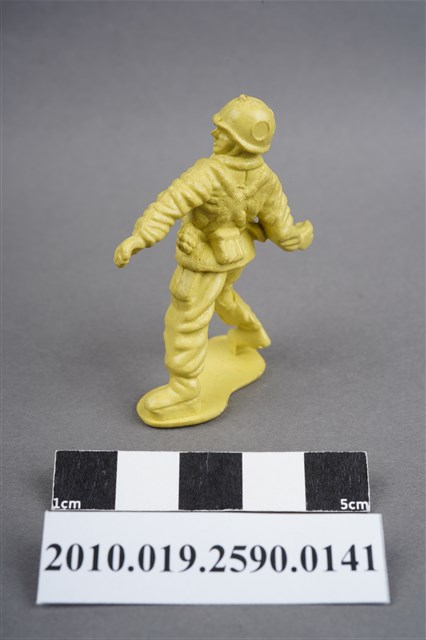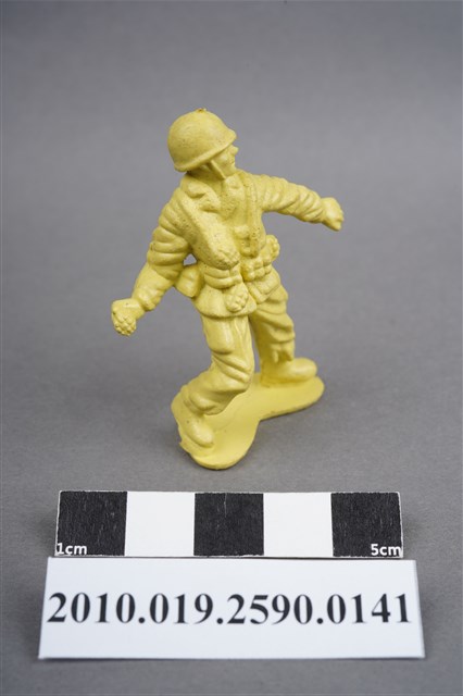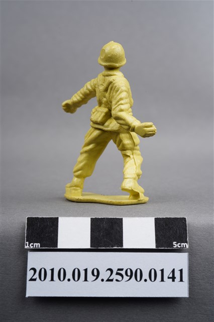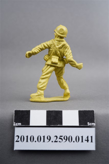 1.本物件為黃色步兵造型玩具士兵,高約5公分,寬約為4公分,為塑膠材質。外型為步兵,士兵頭戴鋼盔,身著軍服,腰帶上及胸前有彈袋、水壺及手榴彈,腳著軍靴,左手握拳,右手持手榴彈,為正要投擲貌。鋼盔左側有一圓形痕。物件整體底部連接著稱為「pod feet」的底板,底板邊緣有些微殘膠,底部有污漬及磨損痕跡。物件兩側可見射出接縫線。本系列玩具士兵多為相同塑膠模版,僅有顏色不同,或是同色同塑膠模版等形式。2.1938年美國玩具公司Bergen Toy and Novelty Co.開始銷售廉價的塑膠微型單色士兵系列,高約2英寸,各有不同的作戰姿勢及工具武器,美軍部分參照美軍部隊使用了軍綠色,之後推出灰色的德軍部隊及黃色的日軍部隊。1950年代因塑膠製造業的蓬勃發展,以及鉛中毒的恐慌,使得塑膠製且價格低廉的玩具士兵取代昂貴的彩繪金屬士兵,並定型為目前廣為人知的二戰系列。除了士兵系列外,市面上亦能見到牛仔與印地安人、太空人、騎士、恐龍、消防員、警察等各種角色。