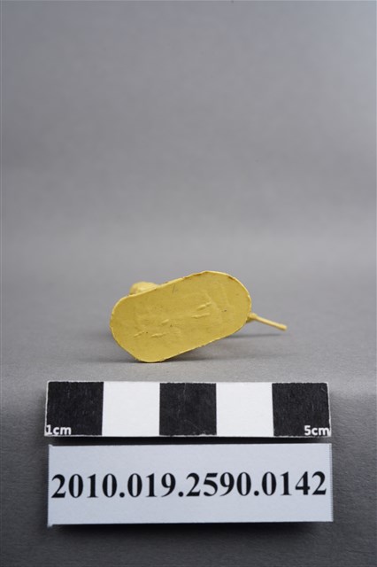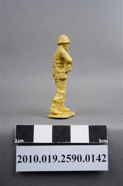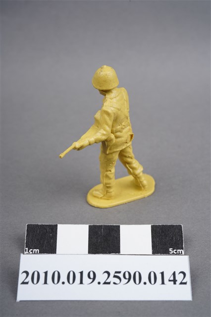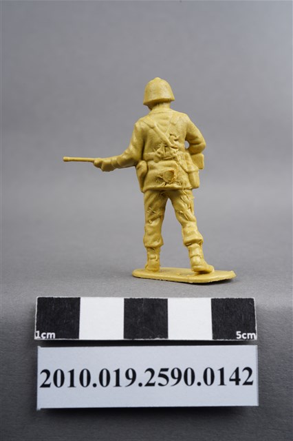 1.本物件為黃色步兵造型玩具士兵,高約5公分,寬約為4公分,為塑膠材質。外型為步兵,士兵頭戴鋼盔,身著軍服,腰帶上有彈袋及水壺,腳著軍靴,雙手平持步槍,左腳略向前跨。臀部有一圓形痕,略呈突出,邊緣有殘膠,背、臀及腿、腳後側,有許多填膠不足造成之不平整處。物件整體底部連接著稱為「pod feet」的底板,底板邊緣有殘膠及磨損痕跡,底部有數道凸痕。物件兩側可見射出接縫線。本系列玩具士兵多為相同塑膠模版,僅有顏色不同,或是同色同塑膠模版等形式。2.1938年美國玩具公司Bergen Toy and Novelty Co.開始銷售廉價的塑膠微型單色士兵系列,高約2英寸,各有不同的作戰姿勢及工具武器,美軍部分參照美軍部隊使用了軍綠色,之後推出灰色的德軍部隊及黃色的日軍部隊。1950年代因塑膠製造業的蓬勃發展,以及鉛中毒的恐慌,使得塑膠製且價格低廉的玩具士兵取代昂貴的彩繪金屬士兵,並定型為目前廣為人知的二戰系列。除了士兵系列外,市面上亦能見到牛仔與印地安人、太空人、騎士、恐龍、消防員、警察等各種角色。