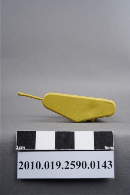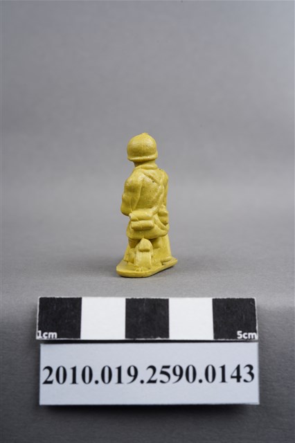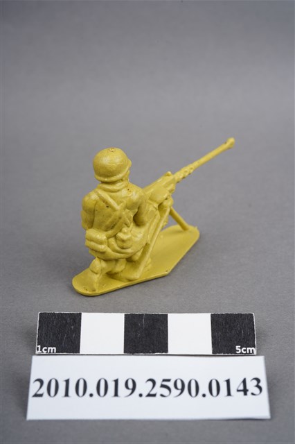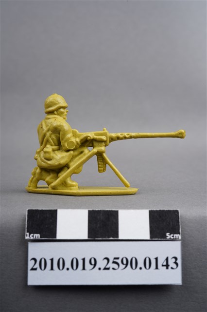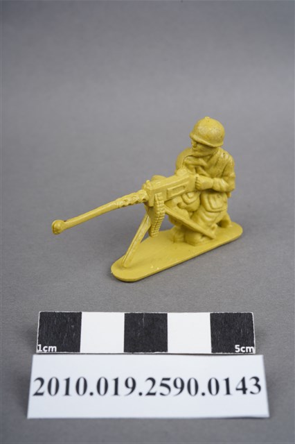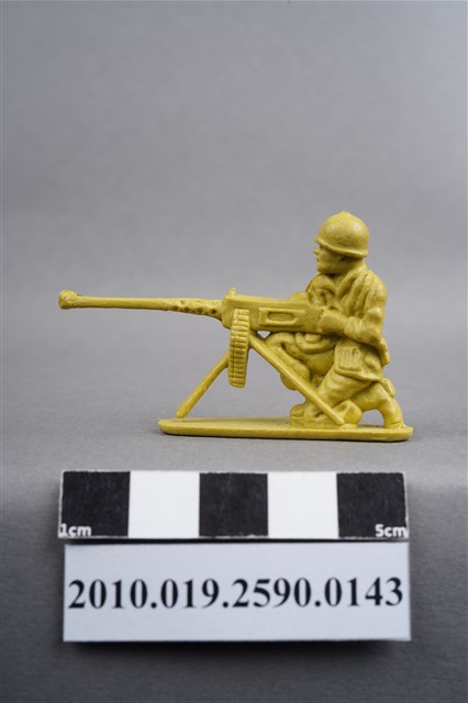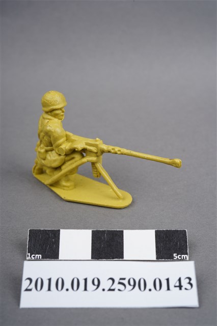 1.本物件為黃色機槍兵造型玩具士兵,高約4公分,長約為5.5公分,為塑膠材質。外型為機槍兵,士兵雙眼直視前方,頭戴鋼盔,身著軍服,腰帶上有彈袋、水壺及腰袋,腳著軍靴,右手肘部有一圓形痕,略顯突出。單膝蹲於機槍前,雙手置於架在三腳架的機槍上,機槍旁懸有一串彈鏈,三腳架底端懸空。整體底部連接著稱為「pod feet」的底板,底板底部有數道白痕及磨痕,物件兩側可見射出接縫線。本系列玩具士兵多為相同塑膠模版,僅有顏色不同,或是同色同塑膠模版等形式。2.1938年美國玩具公司Bergen Toy and Novelty Co.開始銷售廉價的塑膠微型單色士兵系列,高約2英寸,各有不同的作戰姿勢及工具武器,美軍部分參照美軍部隊使用了軍綠色,之後推出灰色的德軍部隊及黃色的日軍部隊。1950年代因塑膠製造業的蓬勃發展,以及鉛中毒的恐慌,使得塑膠製且價格低廉的玩具士兵取代昂貴的彩繪金屬士兵,並定型為目前廣為人知的二戰系列。除了士兵系列外,市面上亦能見到牛仔與印地安人、太空人、騎士、恐龍、消防員、警察等各種角色。