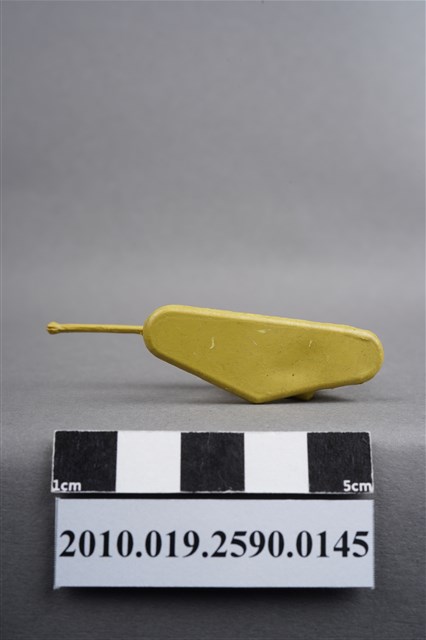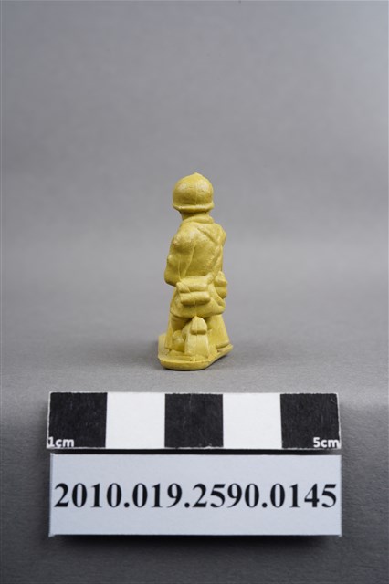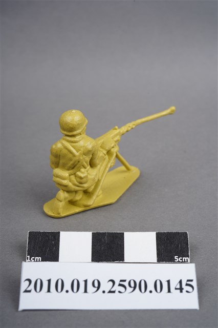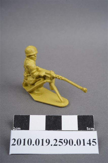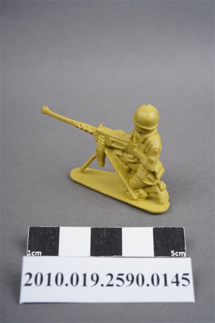 1.本物件為黃色機槍兵造型玩具士兵,高約4公分,長約為5.5公分,為塑膠材質。外型為機槍兵,士兵雙眼直視前方,頭戴鋼盔,身著軍服,腰帶上有彈袋、水壺及腰袋,腳著軍靴,右手肘部有一圓形痕,略顯突出。單膝蹲於機槍前,雙手置於架在三腳架的機槍上,機槍旁懸有一串彈鏈,三腳架底端懸空。整體底部連接著稱為「pod feet」的底板,底板底部有數道白痕及磨痕,物件兩側可見射出接縫線,整體有多處磨損髒污的情況。本系列玩具士兵多為相同塑膠模版,僅有顏色不同,或是同色同塑膠模版等形式。2.1938年美國玩具公司Bergen Toy and Novelty Co.開始銷售廉價的塑膠微型單色士兵系列,高約2英寸,各有不同的作戰姿勢及工具武器,美軍部分參照美軍部隊使用了軍綠色,之後推出灰色的德軍部隊及黃色的日軍部隊。1950年代因塑膠製造業的蓬勃發展,以及鉛中毒的恐慌,使得塑膠製且價格低廉的玩具士兵取代昂貴的彩繪金屬士兵,並定型為目前廣為人知的二戰系列。除了士兵系列外,市面上亦能見到牛仔與印地安人、太空人、騎士、恐龍、消防員、警察等各種角色。