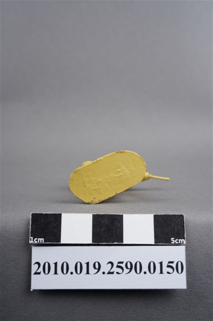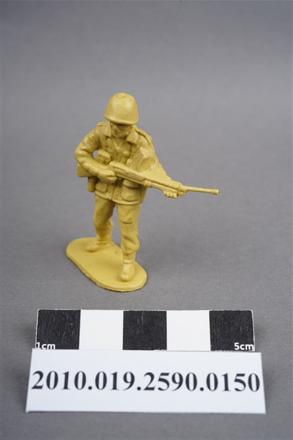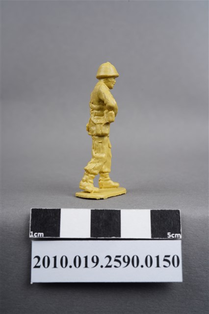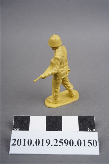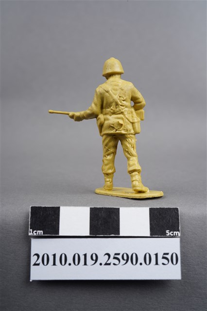 1.本物件為黃色步兵造型玩具士兵,高約5公分,寬約為4公分,為塑膠材質。外型為步兵,士兵頭戴鋼盔,身著軍服,腰帶上有彈袋及水壺,腳著軍靴,雙手平持步槍,左腳略向前跨。臀部有一圓形痕,邊緣有殘膠,背、臀及腿、腳後側,有多處因填膠不足造成之不平整處。物件整體底部連接著稱為「pod feet」的底板,底板邊緣有殘膠,底部有多道凸痕。物件兩側可見射出接縫線,整體有明顯之使用痕跡。本系列玩具士兵多為相同塑膠模版,僅有顏色不同,或是同色同塑膠模版等形式。2.1938年美國玩具公司Bergen Toy and Novelty Co.開始銷售廉價的塑膠微型單色士兵系列,高約2英寸,各有不同的作戰姿勢及工具武器,美軍部分參照美軍部隊使用了軍綠色,之後推出灰色的德軍部隊及黃色的日軍部隊。1950年代因塑膠製造業的蓬勃發展,以及鉛中毒的恐慌,使得塑膠製且價格低廉的玩具士兵取代昂貴的彩繪金屬士兵,並定型為目前廣為人知的二戰系列。除了士兵系列外,市面上亦能見到牛仔與印地安人、太空人、騎士、恐龍、消防員、警察等各種角色。