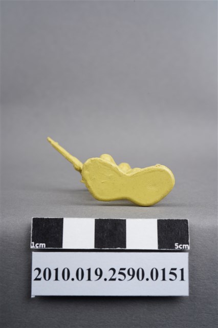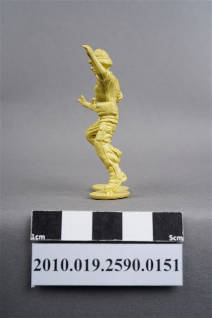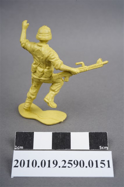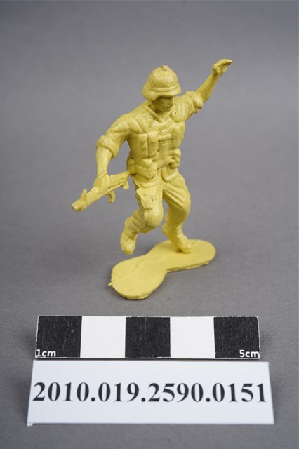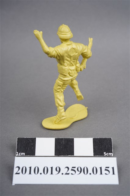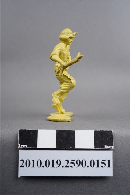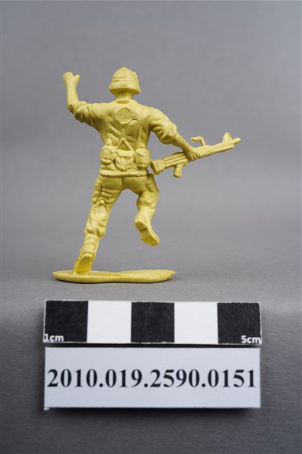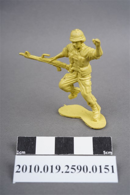 1.本物件為黃色步兵造型玩具士兵,高約4公分,寬約為5公分,為塑膠材質。外型為步兵,士兵頭戴鋼盔,身著軍服,腰帶上有彈袋及水壺等多樣物品,腳著軍靴,右手持機槍,左手高舉似向前方指引,為奔跑姿。上背部、左腿間各有一圓形痕。物件整體底部連接著稱為「pod feet」的底板,底板邊緣有殘膠,底部有磨損痕跡。物件兩側可見射出接縫線,整體有多處摺皺處卡有污沕。本系列玩具士兵多為相同塑膠模版,僅有顏色不同,或是同色同塑膠模版等形式。2.1938年美國玩具公司Bergen Toy and Novelty Co.開始銷售廉價的塑膠微型單色士兵系列,高約2英寸,各有不同的作戰姿勢及工具武器,美軍部分參照美軍部隊使用了軍綠色,之後推出灰色的德軍部隊及黃色的日軍部隊。1950年代因塑膠製造業的蓬勃發展,以及鉛中毒的恐慌,使得塑膠製且價格低廉的玩具士兵取代昂貴的彩繪金屬士兵,並定型為目前廣為人知的二戰系列。除了士兵系列外,市面上亦能見到牛仔與印地安人、太空人、騎士、恐龍、消防員、警察等各種角色。