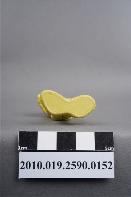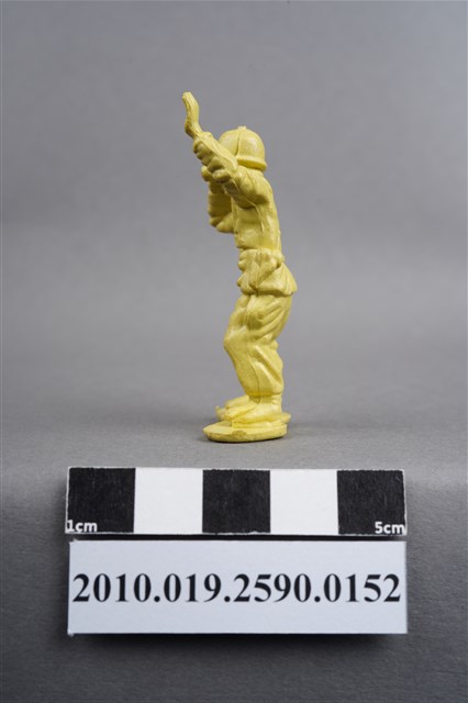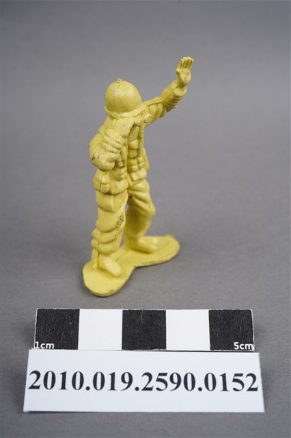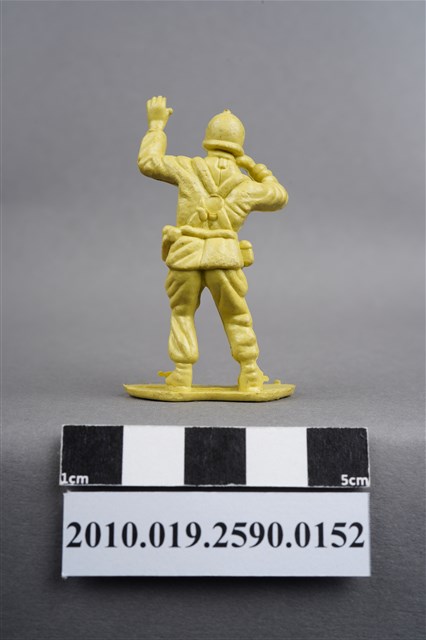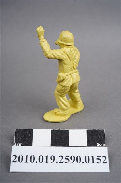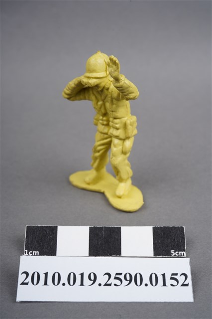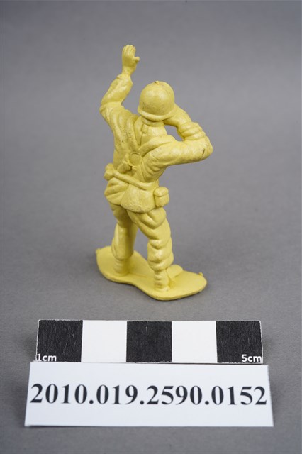 1.本物件為黃色通訊兵造型玩具士兵,高約5公分,寬約為3.5公分,為塑膠材質。外型為通訊兵,士兵頭戴鋼盔,身著軍服,腰帶上有彈袋、水壺及槍袋,腳著軍靴。右手持雙筒望遠鏡於眼前,左手高舉似向前方人員指示。兩腿褲管有多處污損,右多於左。背部有一圓形痕,兩腳有溢膠而不平整。物件整體底部連接著稱為「pod feet」的底板,底板底部平整,邊緣微凸略有殘膠。物件兩側可見射出接縫線。本系列玩具士兵多為相同塑膠模版,僅有顏色不同,或是同色同塑膠模版等形式。2.1938年美國玩具公司Bergen Toy and Novelty Co.開始銷售廉價的塑膠微型單色士兵系列,高約2英寸,各有不同的作戰姿勢及工具武器,美軍部分參照美軍部隊使用了軍綠色,之後推出灰色的德軍部隊及黃色的日軍部隊。1950年代因塑膠製造業的蓬勃發展,以及鉛中毒的恐慌,使得塑膠製且價格低廉的玩具士兵取代昂貴的彩繪金屬士兵,並定型為目前廣為人知的二戰系列。除了士兵系列外,市面上亦能見到牛仔與印地安人、太空人、騎士、恐龍、消防員、警察等各種角色。