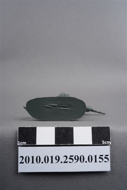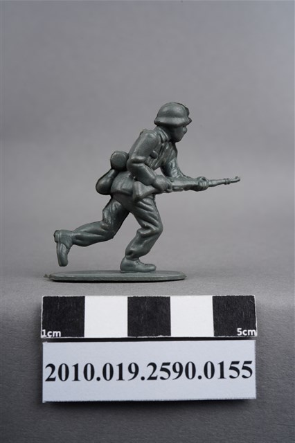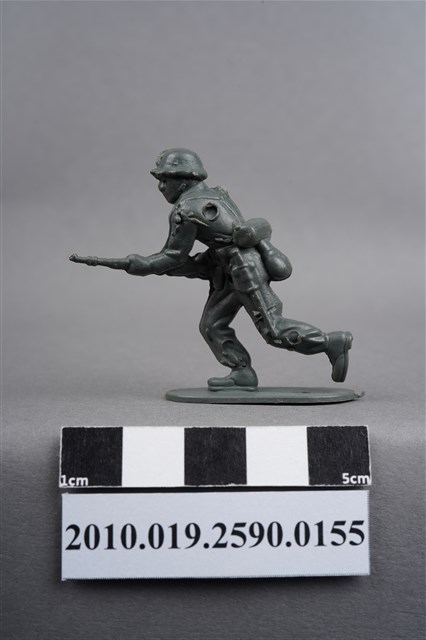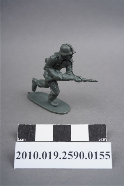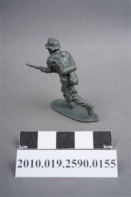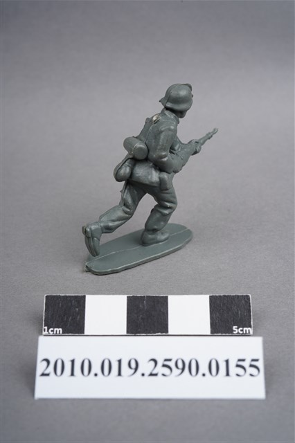 1.本物件為灰色步兵造型玩具士兵,高約4公分,寬約為5公分,為塑膠材質。外型為步兵,士兵頭戴鋼盔,身著軍服,腰帶上有彈袋、水壺、腰袋及疑似工兵鏟等物品,腳著軍靴,雙手持步槍,呈奔跑姿。上背處有射出痕,邊緣有殘膠。左背有一凹陷之圓形痕,右小腿內側及左小腿外側各有一圓形痕,邊緣有殘膠。左手上臂處有填膠不足造成的不平整處。物件整體底部連接著稱為「pod feet」的底板,底板底病有數道凸痕,邊緣有磨損及殘膠情況。物件兩側可見射出接縫線。本系列玩具士兵多為相同塑膠模版,僅有顏色不同,或是同色同塑膠模版等形式。2.1938年美國玩具公司Bergen Toy and Novelty Co.開始銷售廉價的塑膠微型單色士兵系列,高約2英寸,各有不同的作戰姿勢及工具武器,美軍部分參照美軍部隊使用了軍綠色,之後推出灰色的德軍部隊及黃色的日軍部隊。1950年代因塑膠製造業的蓬勃發展,以及鉛中毒的恐慌,使得塑膠製且價格低廉的玩具士兵取代昂貴的彩繪金屬士兵,並定型為目前廣為人知的二戰系列。除了士兵系列外,市面上亦能見到牛仔與印地安人、太空人、騎士、恐龍、消防員、警察等各種角色。