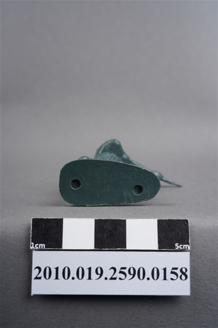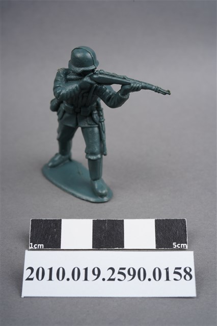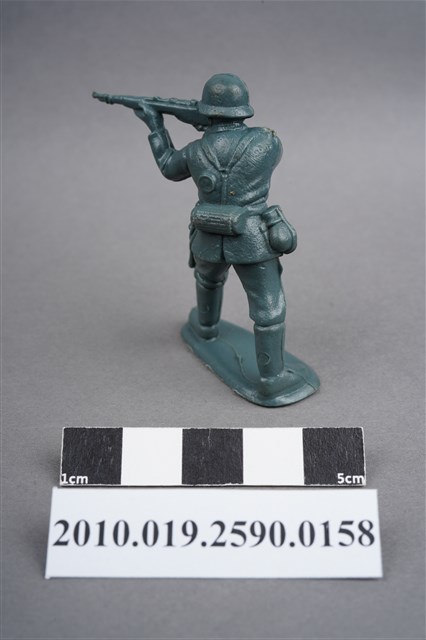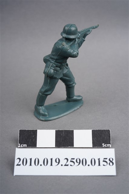 1.本物件為藍綠色步兵造型玩具士兵,高約3.5公分,寬約為5公分,為塑膠材質。外型為步兵,士兵頭戴鋼盔,身著軍服,腰帶上有彈袋、水壺、腰袋、刺刀及工兵鏟等物品,腳著軍靴,雙手平舉步槍瞄準前方。左背部有一凸出之圓形痕,兩小腿後側各有一圓形痕,右肩有射出痕。物件整體底部連接著稱為「pod feet」的底板,底板邊緣及底部均不甚平整,底部有兩個圓洞。物件兩側可見射出接縫線。本系列玩具士兵多為相同塑膠模版,僅有顏色不同,或是同色同塑膠模版等形式。2.1938年美國玩具公司Bergen Toy and Novelty Co.開始銷售廉價的塑膠微型單色士兵系列,高約2英寸,各有不同的作戰姿勢及工具武器,美軍部分參照美軍部隊使用了軍綠色,之後推出灰色的德軍部隊及黃色的日軍部隊。1950年代因塑膠製造業的蓬勃發展,以及鉛中毒的恐慌,使得塑膠製且價格低廉的玩具士兵取代昂貴的彩繪金屬士兵,並定型為目前廣為人知的二戰系列。除了士兵系列外,市面上亦能見到牛仔與印地安人、太空人、騎士、恐龍、消防員、警察等各種角色。