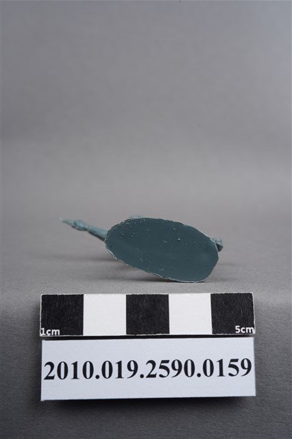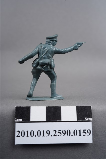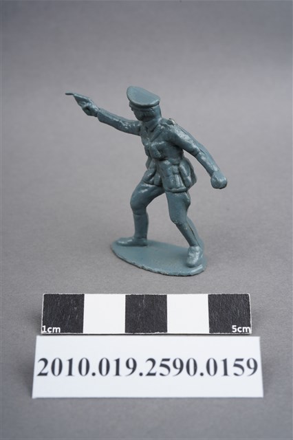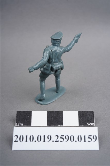 1.本物件為藍綠色軍官造型玩具士兵,高約4.5公分,寬約為5公分,為塑膠材質。外型為軍官,軍官頭戴軍帽,身著軍服,腰帶上有彈袋、水壺、腰袋及手槍槍袋,腳著軍靴,右手持手槍瞄準前方,左手握拳,右腳往前跨一步。右臀有一射出痕,略顯凸出,邊緣有殘膠,左膠有突起之射出痕跡。物件整體底部連接著稱為「pod feet」的底板,底板邊緣有磨損情況,底部不甚平整,有數個點狀突起。物件兩側可見射出接縫線。本系列玩具士兵多為相同塑膠模版,僅有顏色不同,或是同色同塑膠模版等形式。2.1938年美國玩具公司Bergen Toy and Novelty Co.開始銷售廉價的塑膠微型單色士兵系列,高約2英寸,各有不同的作戰姿勢及工具武器,美軍部分參照美軍部隊使用了軍綠色,之後推出灰色的德軍部隊及黃色的日軍部隊。1950年代因塑膠製造業的蓬勃發展,以及鉛中毒的恐慌,使得塑膠製且價格低廉的玩具士兵取代昂貴的彩繪金屬士兵,並定型為目前廣為人知的二戰系列。除了士兵系列外,市面上亦能見到牛仔與印地安人、太空人、騎士、恐龍、消防員、警察等各種角色。