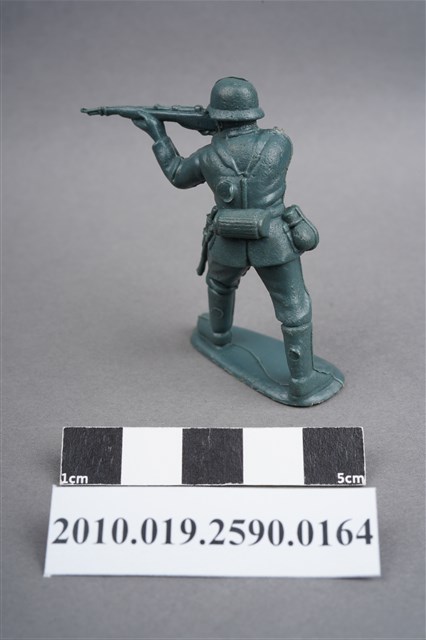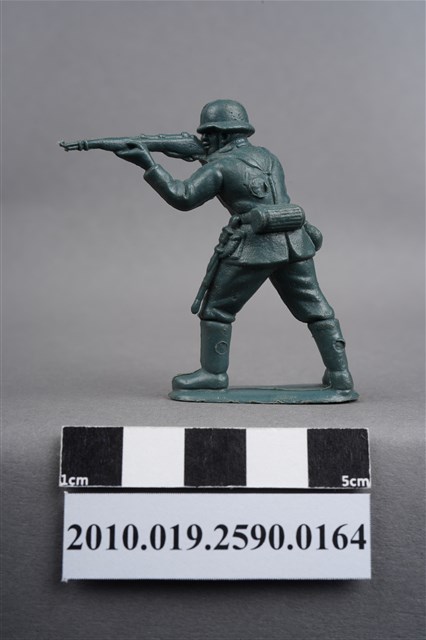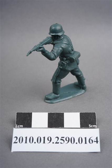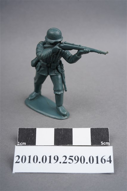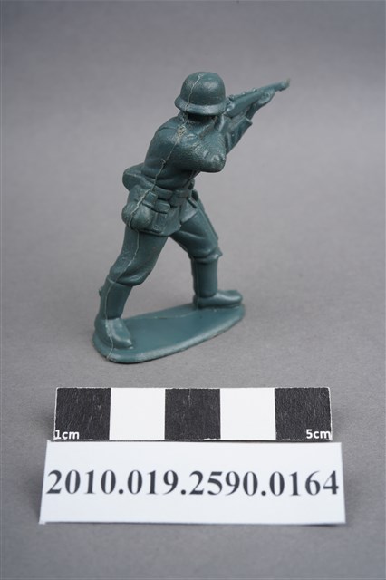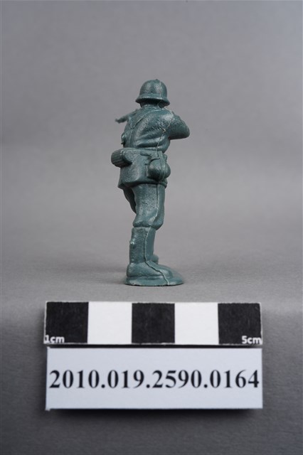 1.本物件為藍綠色步兵造型玩具士兵,高約3.5公分,寬約為5公分,為塑膠材質。外型為步兵,士兵頭戴鋼盔,身著軍服,腰帶上有彈袋、水壺、腰袋及刺刀、工兵鏟等物品,腳著軍靴,雙手平舉步槍瞄準前方。右肩處有射出痕,左背部及兩小腿後側各有一圓形痕,邊緣有殘膠。物件整體底部連接著稱為「pod feet」的底板,底板邊緣有磨損,底部兩端各有一圓洞。物件兩側可見射出接縫線。本系列玩具士兵多為相同塑膠模版,僅有顏色不同,或是同色同塑膠模版等形式。2.1938年美國玩具公司Bergen Toy and Novelty Co.開始銷售廉價的塑膠微型單色士兵系列,高約2英寸,各有不同的作戰姿勢及工具武器,美軍部分參照美軍部隊使用了軍綠色,之後推出灰色的德軍部隊及黃色的日軍部隊。1950年代因塑膠製造業的蓬勃發展,以及鉛中毒的恐慌,使得塑膠製且價格低廉的玩具士兵取代昂貴的彩繪金屬士兵,並定型為目前廣為人知的二戰系列。除了士兵系列外,市面上亦能見到牛仔與印地安人、太空人、騎士、恐龍、消防員、警察等各種角色。