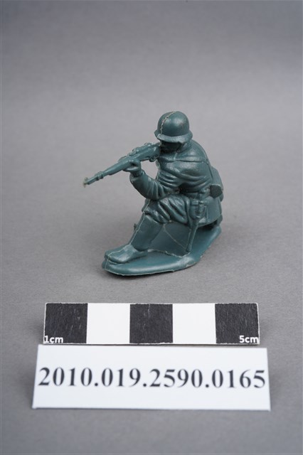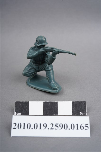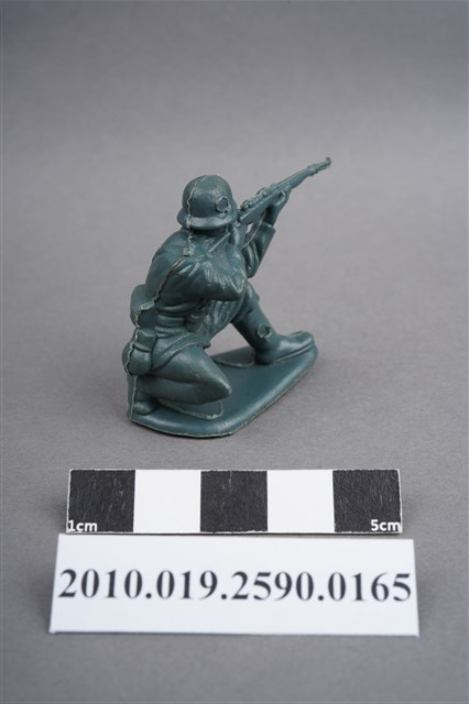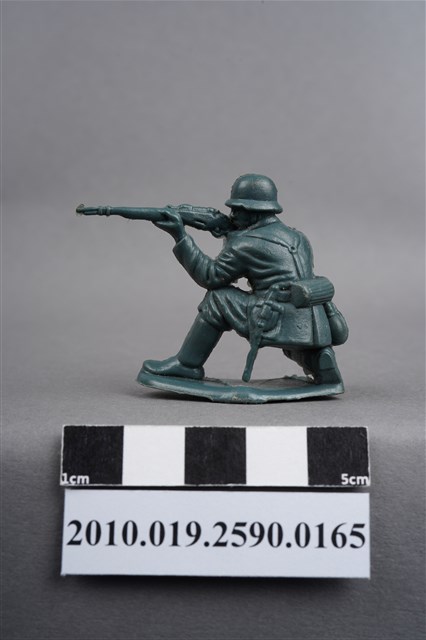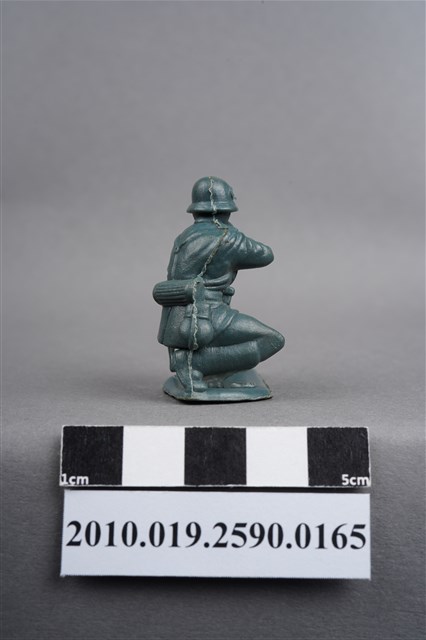 1.本物件為藍綠色步槍兵造型玩具士兵,高約3公分,寬約為4公分,為塑膠材質。外型為步槍兵,士兵頭戴鋼盔,身著軍服,腰帶上有彈袋、水壺、腰袋及疑似工兵鏟之物品,腳著軍靴,呈單膝蹲姿,雙手持步槍瞄準前方。鋼盔右側及左小腿內側各有一圓形痕,邊緣有殘膠。物件整體底部連接著稱為「pod feet」的底板,底板略微上翹,邊緣有殘膠,底部有磨損及溢膠。物件兩側可見射出接縫線。本系列玩具士兵多為相同塑膠模版,僅有顏色不同,或是同色同塑膠模版等形式。2.1938年美國玩具公司Bergen Toy and Novelty Co.開始銷售廉價的塑膠微型單色士兵系列,高約2英寸,各有不同的作戰姿勢及工具武器,美軍部分參照美軍部隊使用了軍綠色,之後推出灰色的德軍部隊及黃色的日軍部隊。1950年代因塑膠製造業的蓬勃發展,以及鉛中毒的恐慌,使得塑膠製且價格低廉的玩具士兵取代昂貴的彩繪金屬士兵,並定型為目前廣為人知的二戰系列。除了士兵系列外,市面上亦能見到牛仔與印地安人、太空人、騎士、恐龍、消防員、警察等各種角色。