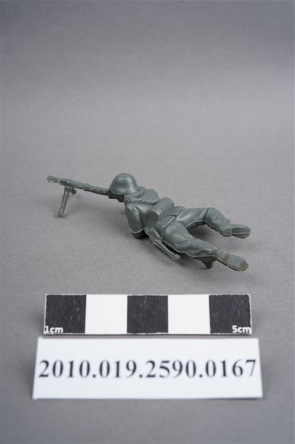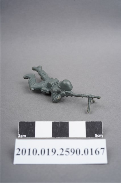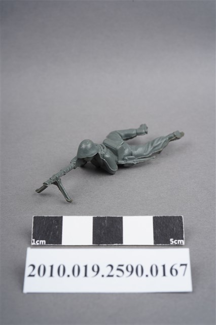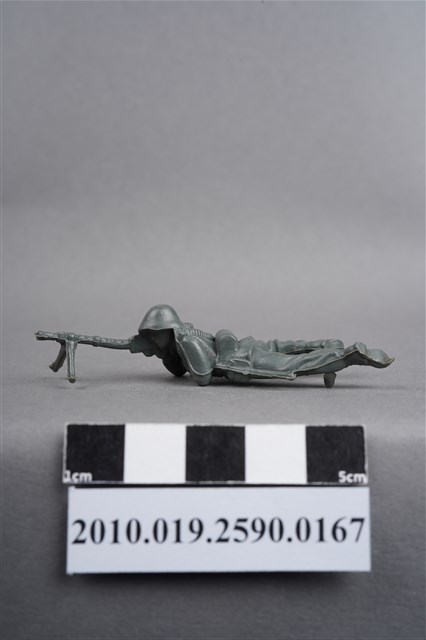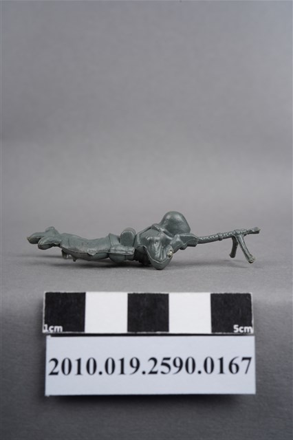 1.本物件為藍綠色狙擊兵造型玩具士兵,高約1.5公分,長約為6公分,為塑膠材質。外型為狙擊兵,士兵頭戴鋼盔,身著軍服,腰帶上有水壺、腰袋及工兵鏟,腳著軍靴,呈趴卧姿,右手持握立於雙腳架上的狙擊槍,做瞄準貌,左手置於胸前,後頸及背上有一串彈鍊。狙擊槍結構簡單,槍身及腳架邊緣有殘膠。左手背及兩小腿處各有一圓形痕,均呈凹陷,邊緣有殘膠,兩大腿處有類似碎裂痕,下腹部有一凹洞,右手腕有射出痕,邊緣有破裂情況。物件兩側可見射出接縫線。本系列玩具士兵多為相同塑膠模版,僅有顏色不同,或是同色同塑膠模版等形式。2.1938年美國玩具公司Bergen Toy and Novelty Co.開始銷售廉價的塑膠微型單色士兵系列,高約2英寸,各有不同的作戰姿勢及工具武器,美軍部分參照美軍部隊使用了軍綠色,之後推出灰色的德軍部隊及黃色的日軍部隊。1950年代因塑膠製造業的蓬勃發展,以及鉛中毒的恐慌,使得塑膠製且價格低廉的玩具士兵取代昂貴的彩繪金屬士兵,並定型為目前廣為人知的二戰系列。除了士兵系列外,市面上亦能見到牛仔與印地安人、太空人、騎士、恐龍、消防員、警察等各種角色。