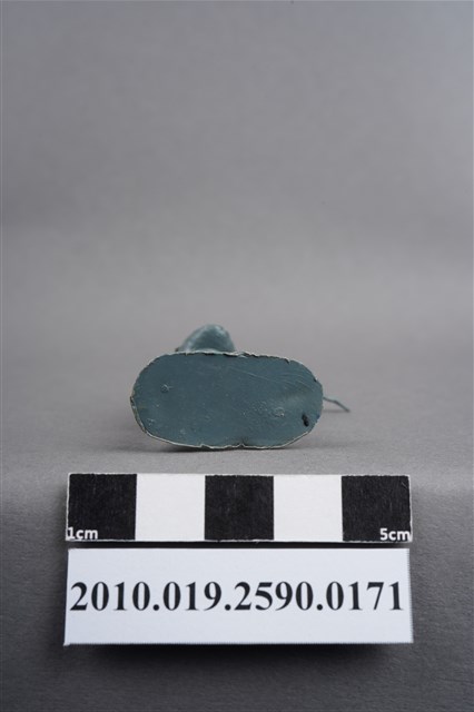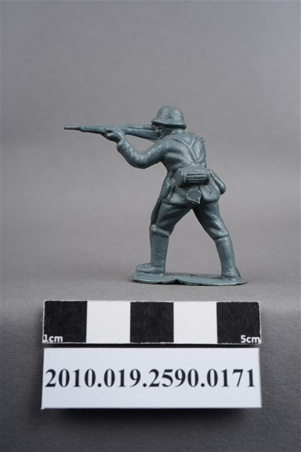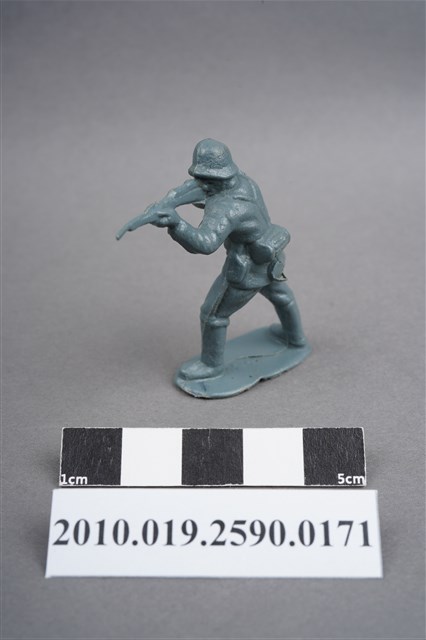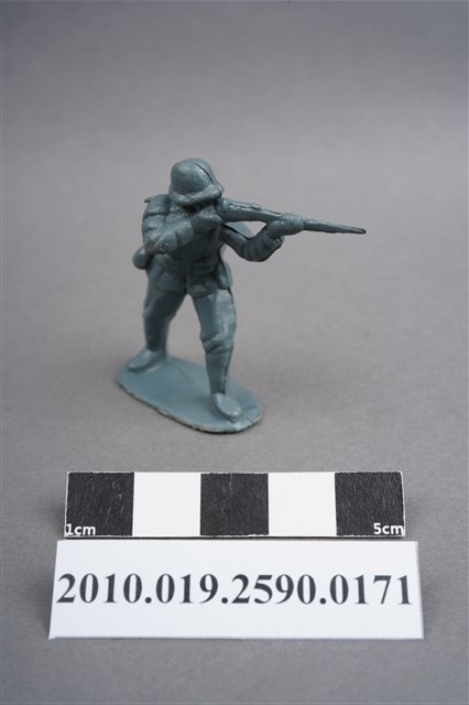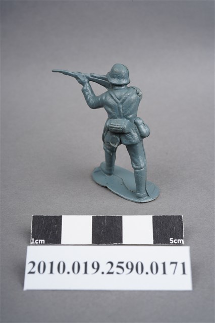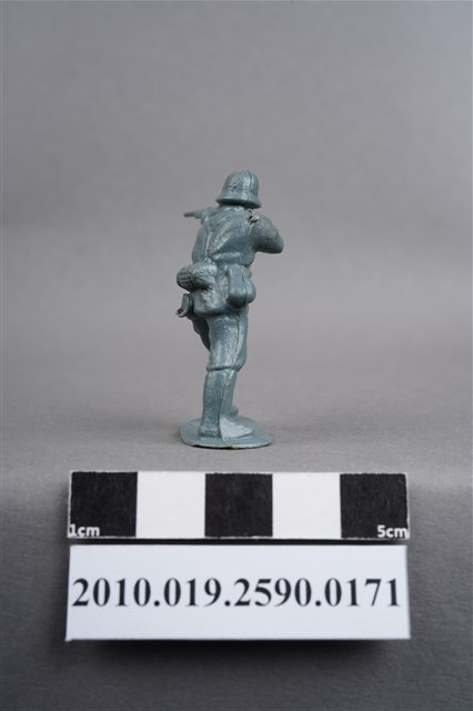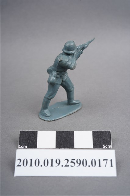 1.本物件為藍綠色步兵造型玩具士兵,高約3.5公分,寬約為5公分,為塑膠材質。外型為步兵,士兵頭戴鋼盔,身著軍服,腰帶上有彈袋、水壺、腰袋及刺刀、工兵鏟等物品,腳著軍靴,雙手平舉步槍瞄準前方。右肩處有射出痕,邊緣略有凹陷情況,且有年輪痕,左臀部有一圓形突起,邊緣有殘膠。物件整體底部連接著稱為「pod feet」的底板,底板邊緣有污損,底部有粒狀突起及污損、溢膠。物件兩側可見射出接縫線。本系列玩具士兵多為相同塑膠模版,僅有顏色不同,或是同色同塑膠模版等形式。2.1938年美國玩具公司Bergen Toy and Novelty Co.開始銷售廉價的塑膠微型單色士兵系列,高約2英寸,各有不同的作戰姿勢及工具武器,美軍部分參照美軍部隊使用了軍綠色,之後推出灰色的德軍部隊及黃色的日軍部隊。1950年代因塑膠製造業的蓬勃發展,以及鉛中毒的恐慌,使得塑膠製且價格低廉的玩具士兵取代昂貴的彩繪金屬士兵,並定型為目前廣為人知的二戰系列。除了士兵系列外,市面上亦能見到牛仔與印地安人、太空人、騎士、恐龍、消防員、警察等各種角色。