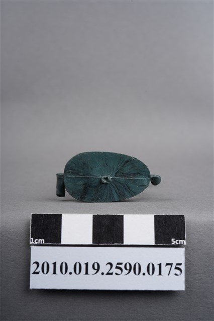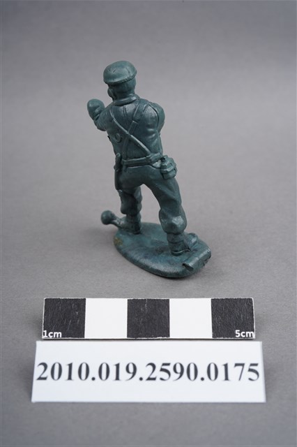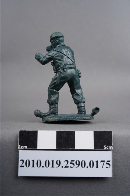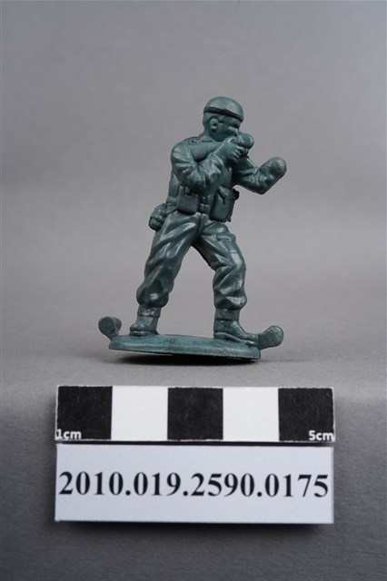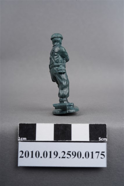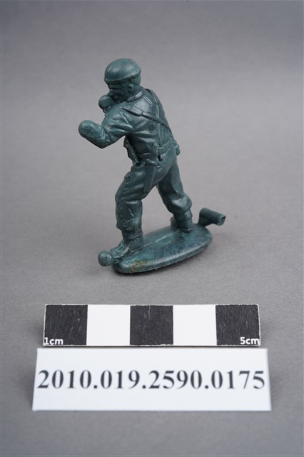 1.本物件為藍綠色步兵造型玩具士兵,高約4.5公分,寬約為3公分,為塑膠材質。外型為步兵,士兵頭戴鋼盔,鋼盔邊緣似已毀損,身著軍服,腰帶上有彈袋、水壺、腰袋及刺刀等物品,腳著軍靴,雙手平舉某種武器瞄準前方,左手腕以下及武器部分已毀損佚失。左背處有一圓形痕。物件整體底部連接著稱為「pod feet」的底板,底板色澤不均,呈大理石紋,兩端各有一柱狀射出殘膠,邊緣有污損,底部可見射出痕及接縫線。物件兩側可見射出接縫線。本系列玩具士兵多為相同塑膠模版,僅有顏色不同,或是同色同塑膠模版等形式。2.1938年美國玩具公司Bergen Toy and Novelty Co.開始銷售廉價的塑膠微型單色士兵系列,高約2英寸,各有不同的作戰姿勢及工具武器,美軍部分參照美軍部隊使用了軍綠色,之後推出灰色的德軍部隊及黃色的日軍部隊。1950年代因塑膠製造業的蓬勃發展,以及鉛中毒的恐慌,使得塑膠製且價格低廉的玩具士兵取代昂貴的彩繪金屬士兵,並定型為目前廣為人知的二戰系列。除了士兵系列外,市面上亦能見到牛仔與印地安人、太空人、騎士、恐龍、消防員、警察等各種角色。