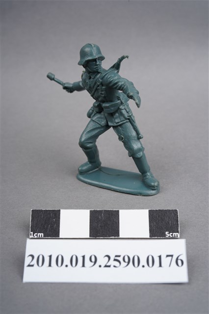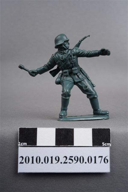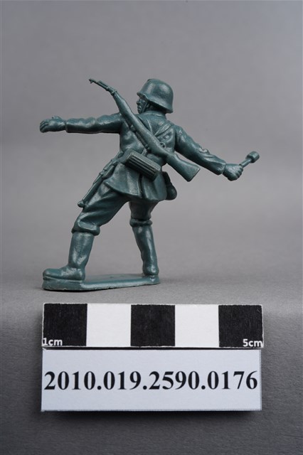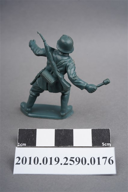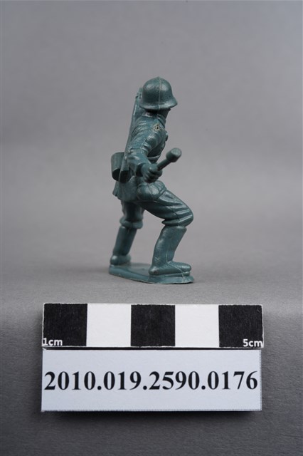 1.本物件為藍綠色步兵造型玩具士兵,高約3.5公分,寬約為5公分,為塑膠材質。外型為步兵,士兵頭戴鋼盔,身著軍服,腰帶上有彈袋、水壺及腰袋,腳著軍靴,左手平舉,右手持手雷,為正要投擲貌。右胸及左大腿各有一圓形痕,邊緣有殘膠。步槍背於身後,槍身有些微扭曲變形,右肩有射出痕突起。物件整體底部連接著稱為「pod feet」的底板,底板邊緣有磨損,底部大致平整,有輕微磨損。物件兩側可見射出接縫線。本系列玩具士兵多為相同塑膠模版,僅有顏色不同,或是同色同塑膠模版等形式。2.1938年美國玩具公司Bergen Toy and Novelty Co.開始銷售廉價的塑膠微型單色士兵系列,高約2英寸,各有不同的作戰姿勢及工具武器,美軍部分參照美軍部隊使用了軍綠色,之後推出灰色的德軍部隊及黃色的日軍部隊。1950年代因塑膠製造業的蓬勃發展,以及鉛中毒的恐慌,使得塑膠製且價格低廉的玩具士兵取代昂貴的彩繪金屬士兵,並定型為目前廣為人知的二戰系列。除了士兵系列外,市面上亦能見到牛仔與印地安人、太空人、騎士、恐龍、消防員、警察等各種角色。