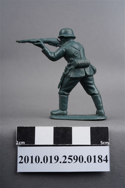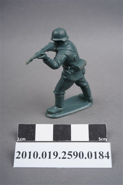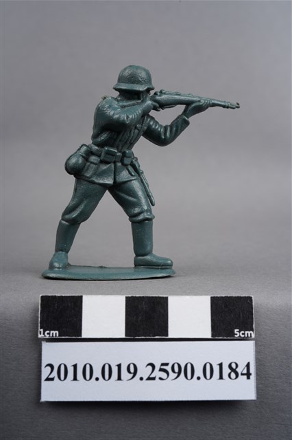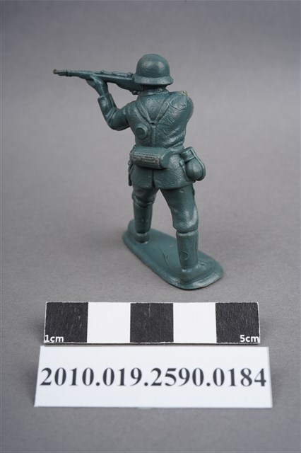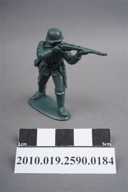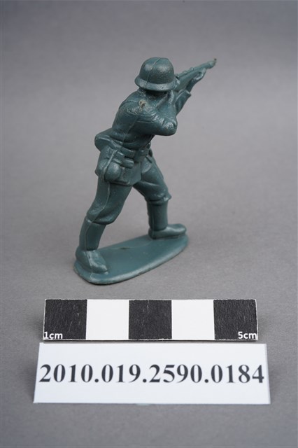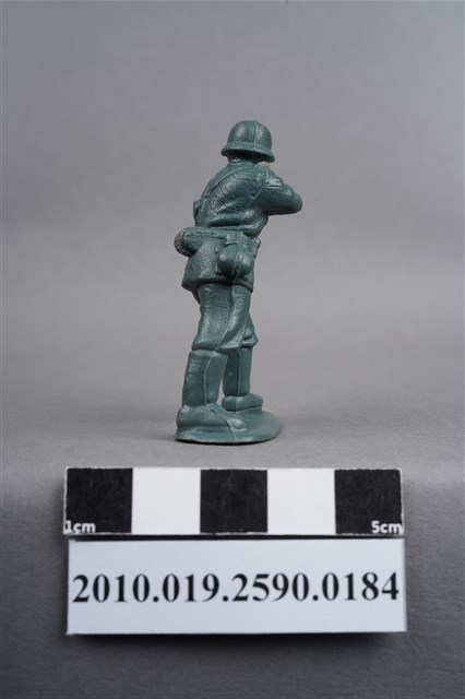 1.本物件為藍綠色步兵造型玩具士兵,高約3.5公分,寬約為5公分,為塑膠材質。外型為步兵,士兵頭戴鋼盔,身著軍服,腰帶上有彈袋、水壺、腰袋及刺刀、工兵鏟等物品,腳著軍靴,雙手平舉步槍瞄準前方。右肩處有射出痕,邊緣有年輪痕。左背部有一圓柱狀突出,兩小腿後側亦各有一圓形痕,後腰腰袋有明顯磨損及髒污。物件整體底部連接著稱為「pod feet」的底板,底板邊緣有溢膠及磨損,底部兩端各有一圓洞,並有污痕及毛屑。物件兩側可見射出接縫線。本系列玩具士兵多為相同塑膠模版,僅有顏色不同,或是同色同塑膠模版等形式。2.1938年美國玩具公司Bergen Toy and Novelty Co.開始銷售廉價的塑膠微型單色士兵系列,高約2英寸,各有不同的作戰姿勢及工具武器,美軍部分參照美軍部隊使用了軍綠色,之後推出灰色的德軍部隊及黃色的日軍部隊。1950年代因塑膠製造業的蓬勃發展,以及鉛中毒的恐慌,使得塑膠製且價格低廉的玩具士兵取代昂貴的彩繪金屬士兵,並定型為目前廣為人知的二戰系列。除了士兵系列外,市面上亦能見到牛仔與印地安人、太空人、騎士、恐龍、消防員、警察等各種角色。