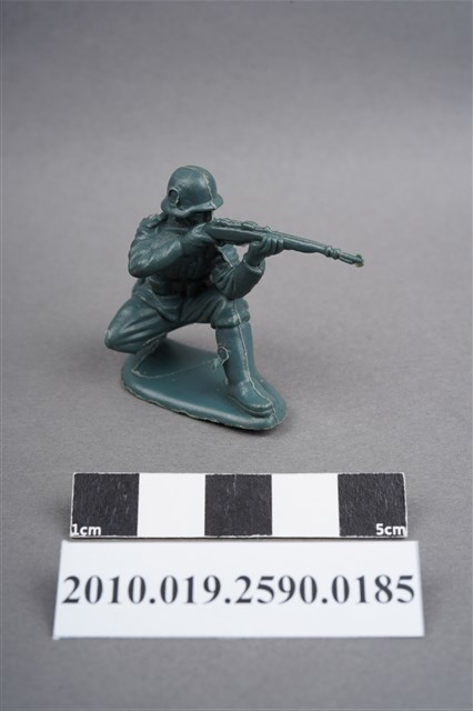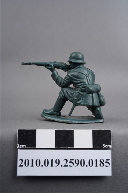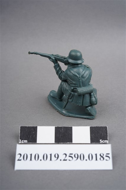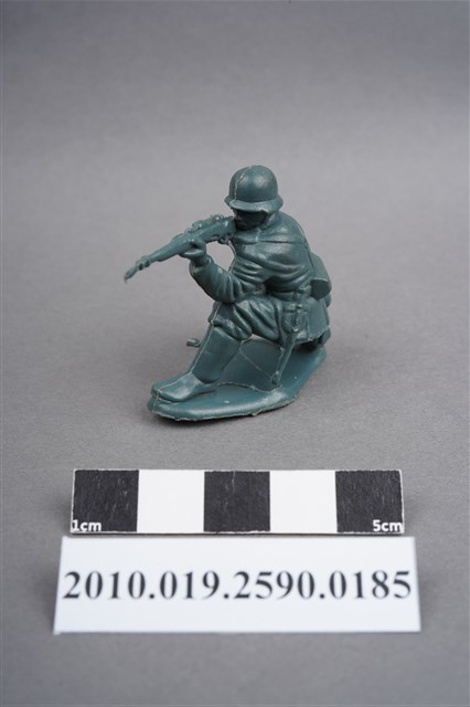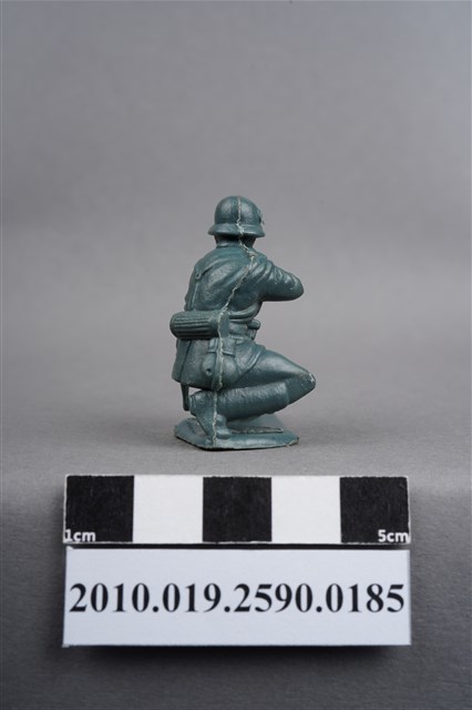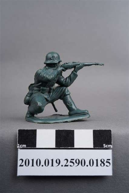 1.本物件為藍綠色步槍兵造型玩具士兵,高約3公分,寬約為4公分,為塑膠材質。外型為步槍兵,士兵頭戴鋼盔,身著軍服,腰帶上有彈袋、水壺、腰袋及工兵鏟,腳著軍靴,呈單膝蹲姿,雙手持步槍瞄準前方。鋼盔右側及左小腿內側各有一圓形痕,邊緣有殘膠,右膝有磨損痕跡。左手與左膝間之三角形空間有白色污物。物件整體底部連接著稱為「pod feet」的底板,底板前端微翹,邊緣及底部有殘膠及磨損。物件兩側可見射出接縫線。本系列玩具士兵多為相同塑膠模版,僅有顏色不同,或是同色同塑膠模版等形式。2.1938年美國玩具公司Bergen Toy and Novelty Co.開始銷售廉價的塑膠微型單色士兵系列,高約2英寸,各有不同的作戰姿勢及工具武器,美軍部分參照美軍部隊使用了軍綠色,之後推出灰色的德軍部隊及黃色的日軍部隊。1950年代因塑膠製造業的蓬勃發展,以及鉛中毒的恐慌,使得塑膠製且價格低廉的玩具士兵取代昂貴的彩繪金屬士兵,並定型為目前廣為人知的二戰系列。除了士兵系列外,市面上亦能見到牛仔與印地安人、太空人、騎士、恐龍、消防員、警察等各種角色。