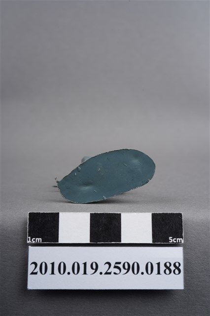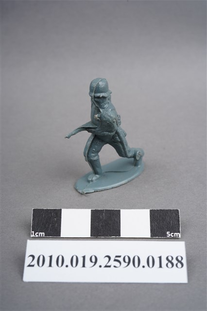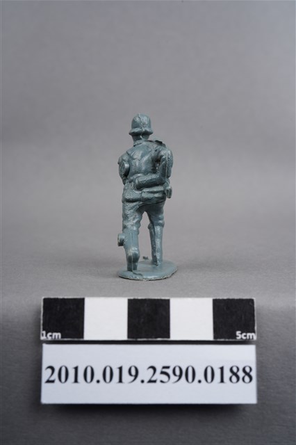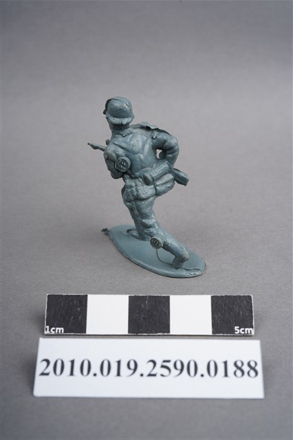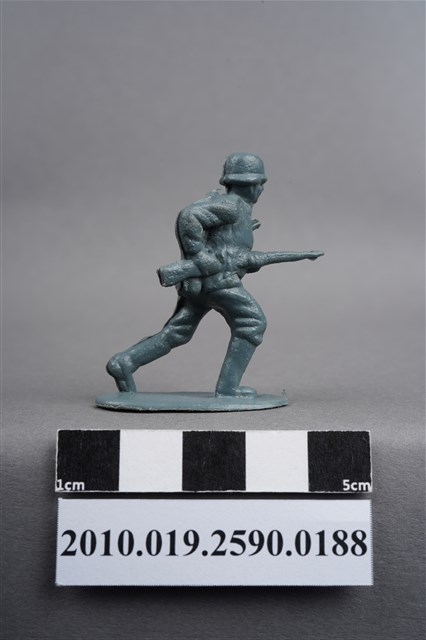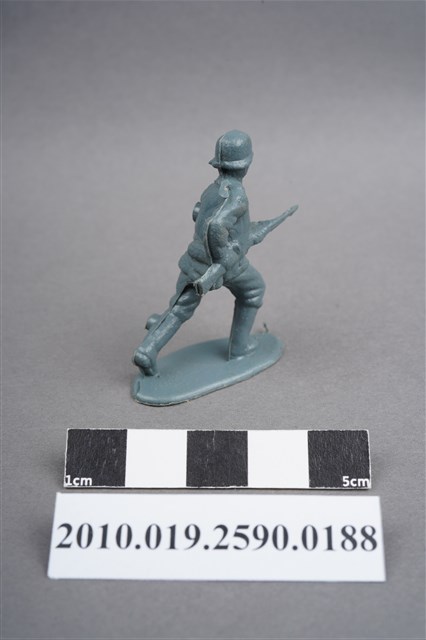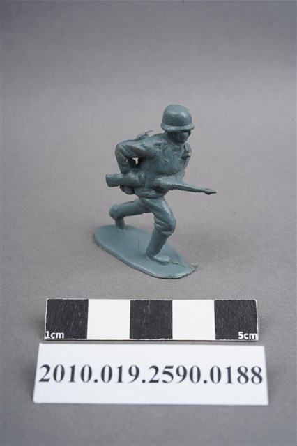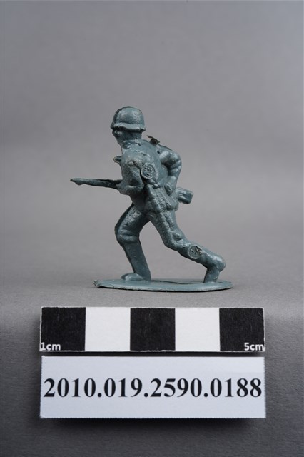 1.本物件為藍綠色步兵造型玩具士兵,高約4公分,寬約為3.5公分,為塑膠材質。外型為步兵,士兵頭戴鋼盔,身著軍服,腰帶上有水壺、腰袋及疑似工兵鏟之物品,腳著軍靴,雙手持步槍於右身側,呈快步行走姿。左背及左小腿外側有柱狀殘膠,截面有凸出之圓點,右肩有大片殘膠。左肩有射出痕及年輪紋,至槍枝處的細部結構被溢膠覆蓋而不明顯。物件整體底部連接著稱為「pod feet」的底板,底板邊緣有磨損及溢膠,底部不甚平整,並有數個不規則形突出痕。物件兩側可見射出接縫線。本系列玩具士兵多為相同塑膠模版,僅有顏色不同,或是同色同塑膠模版等形式。2.1938年美國玩具公司Bergen Toy and Novelty Co.開始銷售廉價的塑膠微型單色士兵系列,高約2英寸,各有不同的作戰姿勢及工具武器,美軍部分參照美軍部隊使用了軍綠色,之後推出灰色的德軍部隊及黃色的日軍部隊。1950年代因塑膠製造業的蓬勃發展,以及鉛中毒的恐慌,使得塑膠製且價格低廉的玩具士兵取代昂貴的彩繪金屬士兵,並定型為目前廣為人知的二戰系列。除了士兵系列外,市面上亦能見到牛仔與印地安人、太空人、騎士、恐龍、消防員、警察等各種角色。