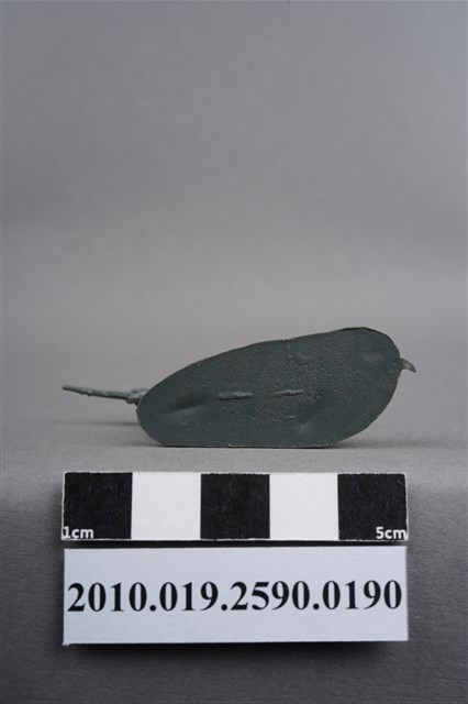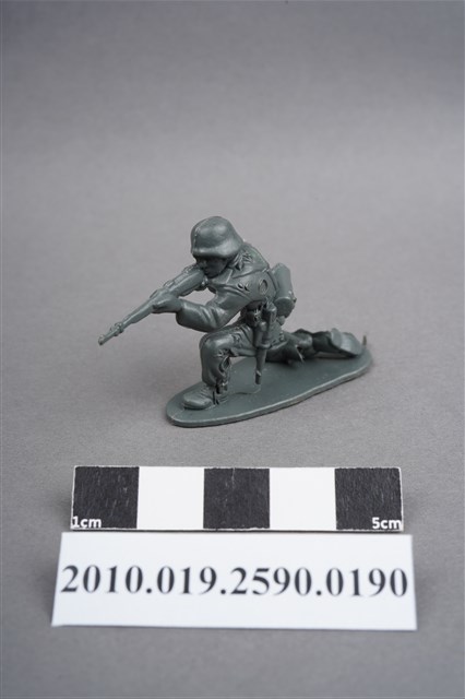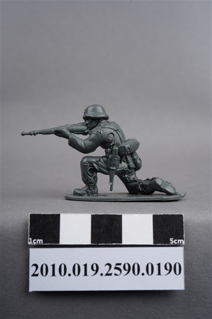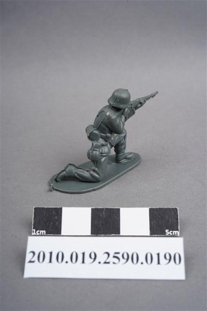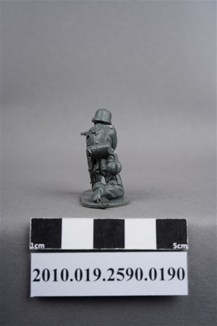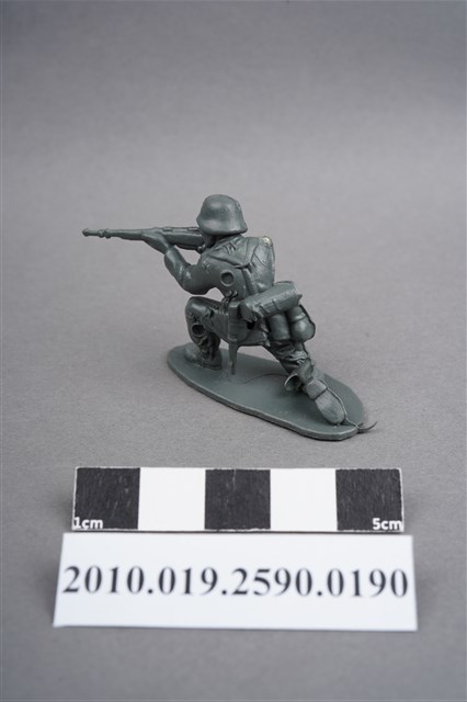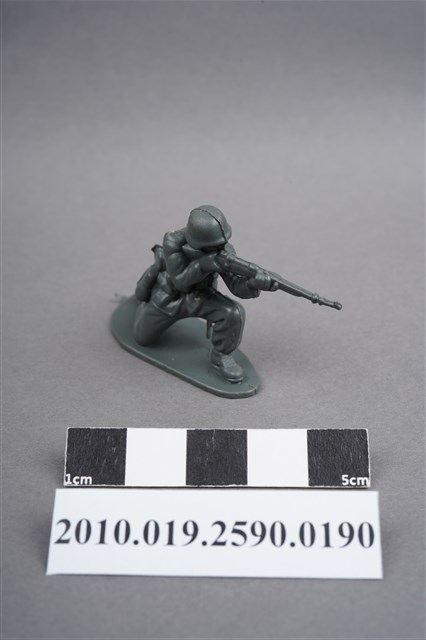 1.本物件為灰色步槍兵造型玩具士兵,高約3公分,長約為5公分,為塑膠材質。外型為步槍兵,士兵頭戴鋼盔,身著軍服,腰帶上有彈袋、水壺、腰袋與工兵鏟,腳著軍靴。單膝跪地,雙手持步槍瞄準前方。左背有一圓形痕,略呈凹陷。右肩有射出痕,左小腿外側與右小腿內側各有一圓形痕,邊緣因填膠不足而有不平處。物件整體底部連接著稱為「pod feet」的底板,底板邊緣有些微殘膠,底部不甚平整,有兩道突起痕。物件兩側可見射出接縫線。本系列玩具士兵多為相同塑膠模版,僅有顏色不同,或是同色同塑膠模版等形式。2.1938年美國玩具公司Bergen Toy and Novelty Co.開始銷售廉價的塑膠微型單色士兵系列,高約2英寸,各有不同的作戰姿勢及工具武器,美軍部分參照美軍部隊使用了軍綠色,之後推出灰色的德軍部隊及黃色的日軍部隊。1950年代因塑膠製造業的蓬勃發展,以及鉛中毒的恐慌,使得塑膠製且價格低廉的玩具士兵取代昂貴的彩繪金屬士兵,並定型為目前廣為人知的二戰系列。除了士兵系列外,市面上亦能見到牛仔與印地安人、太空人、騎士、恐龍、消防員、警察等各種角色。