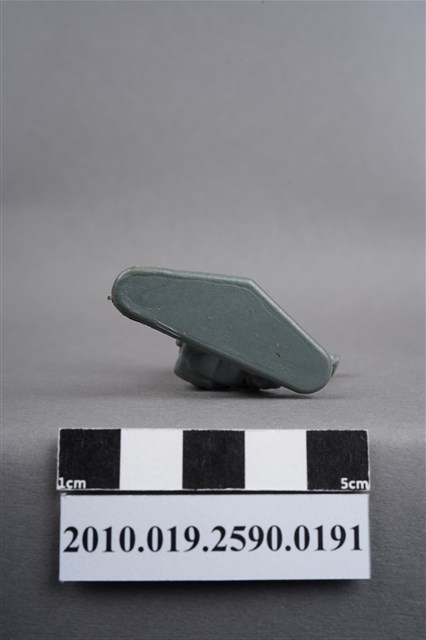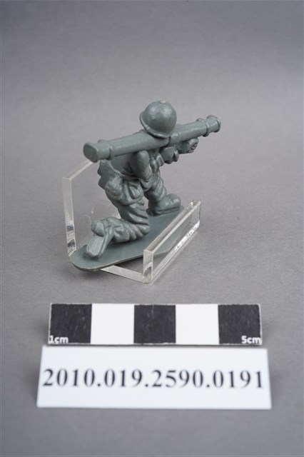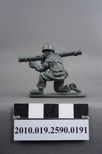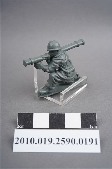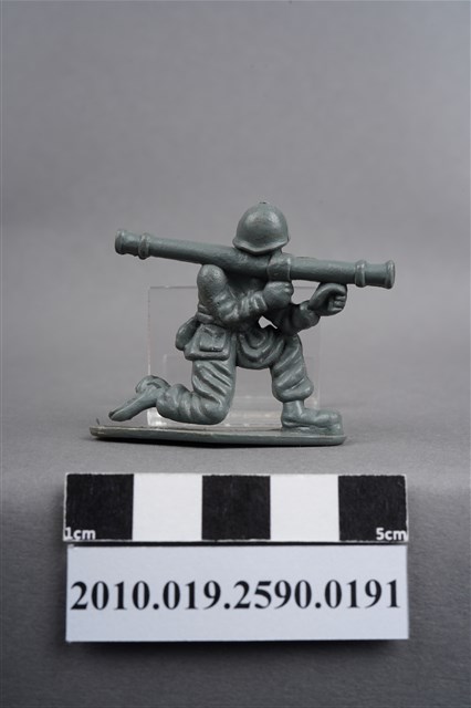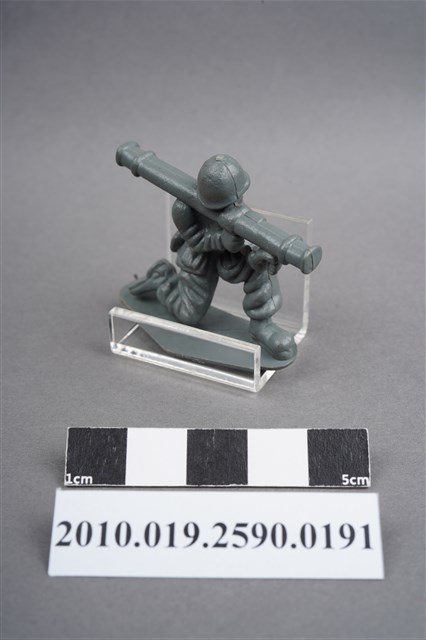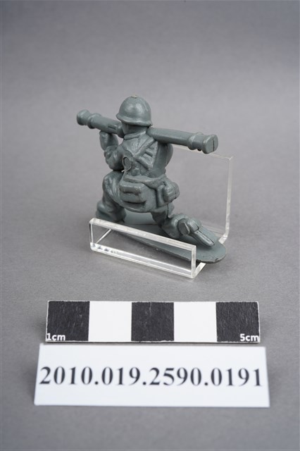 1.本物件為灰色步兵造型玩具士兵,高約3公分,寬約為5公分,為塑膠材質。外型為步兵,士兵頭戴鋼盔,身著軍服,腰帶上有彈袋、腰袋及水壺,腳著軍靴,單膝跪地,右腳虛浮於底板上,雙手持肩扛式火箭筒,呈瞄準姿。左背部及右腳內側各有一圓形痕,略呈凹陷。物件整體底部連接著稱為「pod feet」的底板,底板邊緣有些微殘膠,底部有兩道突起痕及磨損污漬。物件兩側可見射出接縫線。本系列玩具士兵多為相同塑膠模版,僅有顏色不同,或是同色同塑膠模版等形式。2.1938年美國玩具公司Bergen Toy and Novelty Co.開始銷售廉價的塑膠微型單色士兵系列,高約2英寸,各有不同的作戰姿勢及工具武器,美軍部分參照美軍部隊使用了軍綠色,之後推出灰色的德軍部隊及黃色的日軍部隊。1950年代因塑膠製造業的蓬勃發展,以及鉛中毒的恐慌,使得塑膠製且價格低廉的玩具士兵取代昂貴的彩繪金屬士兵,並定型為目前廣為人知的二戰系列。除了士兵系列外,市面上亦能見到牛仔與印地安人、太空人、騎士、恐龍、消防員、警察等各種角色。