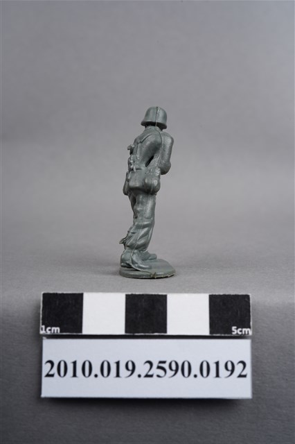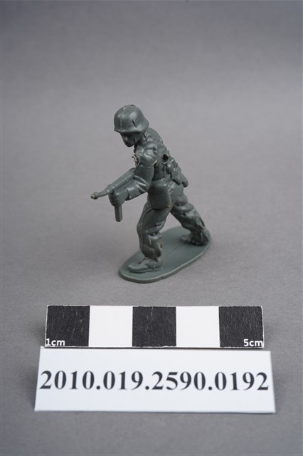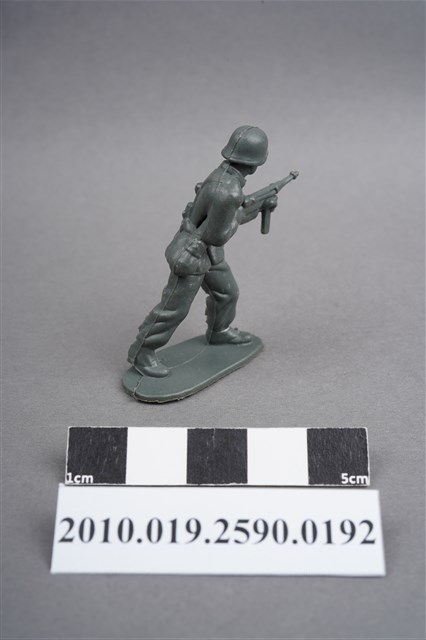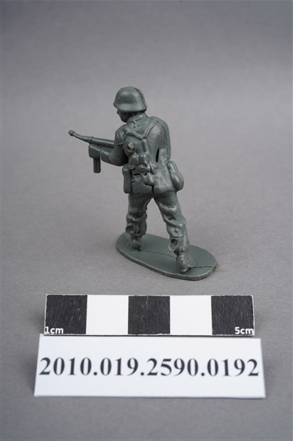 1.本物件為灰色機槍兵造型玩具士兵,高約5公分,寬約為公分,為塑膠材質。外型為機槍兵,士兵頭戴鋼盔,身著軍服,腰帶上有彈袋、腰袋及水壺,腳著軍靴,雙手持衝鋒槍呈行走狀,槍管末端微往上翹。左肩有射出痕,左背部、兩小腿後側各有一圓形痕,邊緣均有殘膠,略呈凹陷。物件整體底部連接著稱為「pod feet」的底板,底板邊緣有磨損及殘膠,底部不平整而有突起痕。物件兩側可見射出接縫線。本系列玩具士兵多為相同塑膠模版,僅有顏色不同,或是同色同塑膠模版等形式。2.1938年美國玩具公司Bergen Toy and Novelty Co.開始銷售廉價的塑膠微型單色士兵系列,高約2英寸,各有不同的作戰姿勢及工具武器,美軍部分參照美軍部隊使用了軍綠色,之後推出灰色的德軍部隊及黃色的日軍部隊。1950年代因塑膠製造業的蓬勃發展,以及鉛中毒的恐慌,使得塑膠製且價格低廉的玩具士兵取代昂貴的彩繪金屬士兵,並定型為目前廣為人知的二戰系列。除了士兵系列外,市面上亦能見到牛仔與印地安人、太空人、騎士、恐龍、消防員、警察等各種角色。